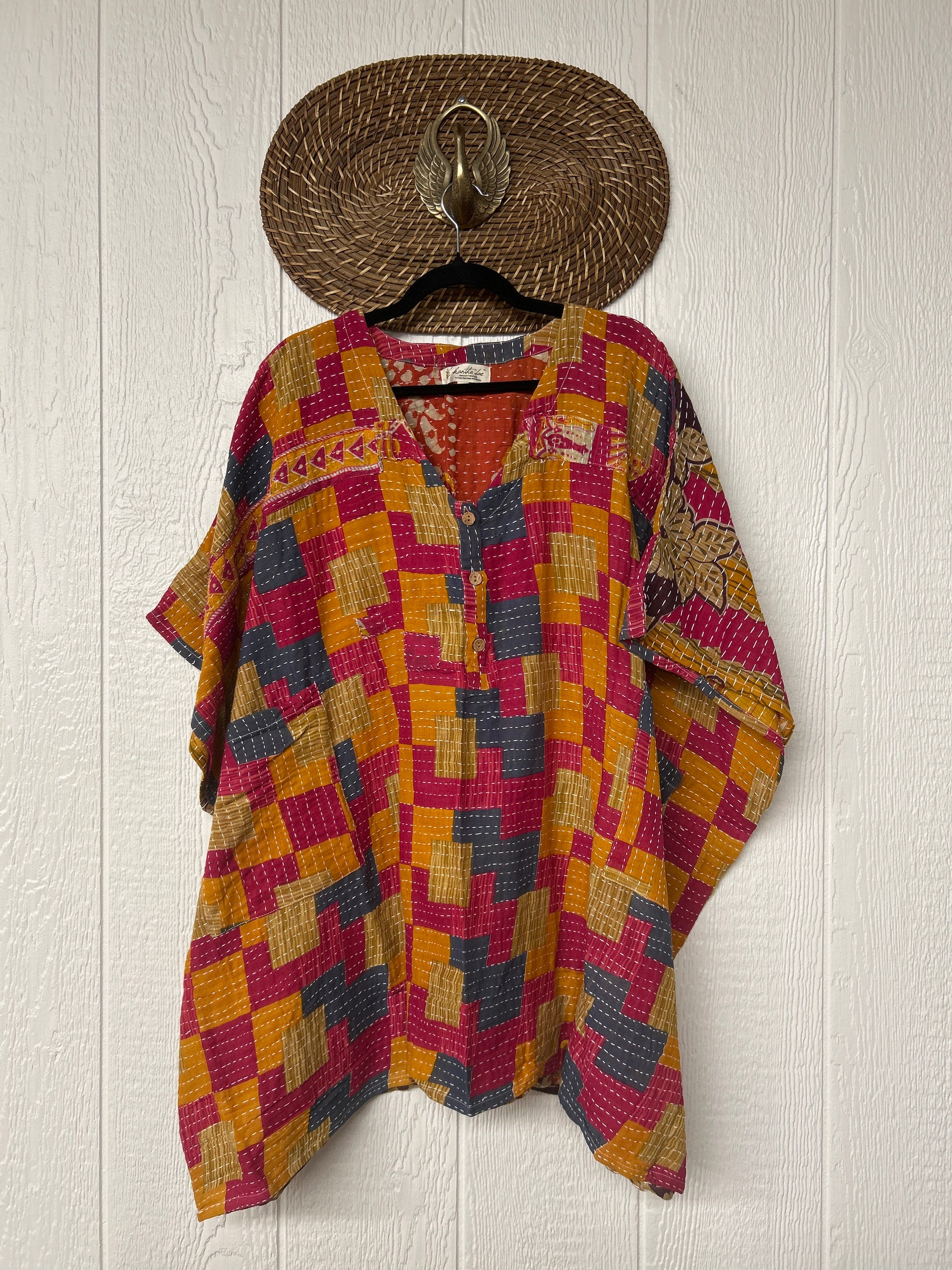 Crafted in our lux vintage kantha stitch cotton sari, this floaty muu is in a new mini length with buttons at the neckline and slouchy exterior pockets.