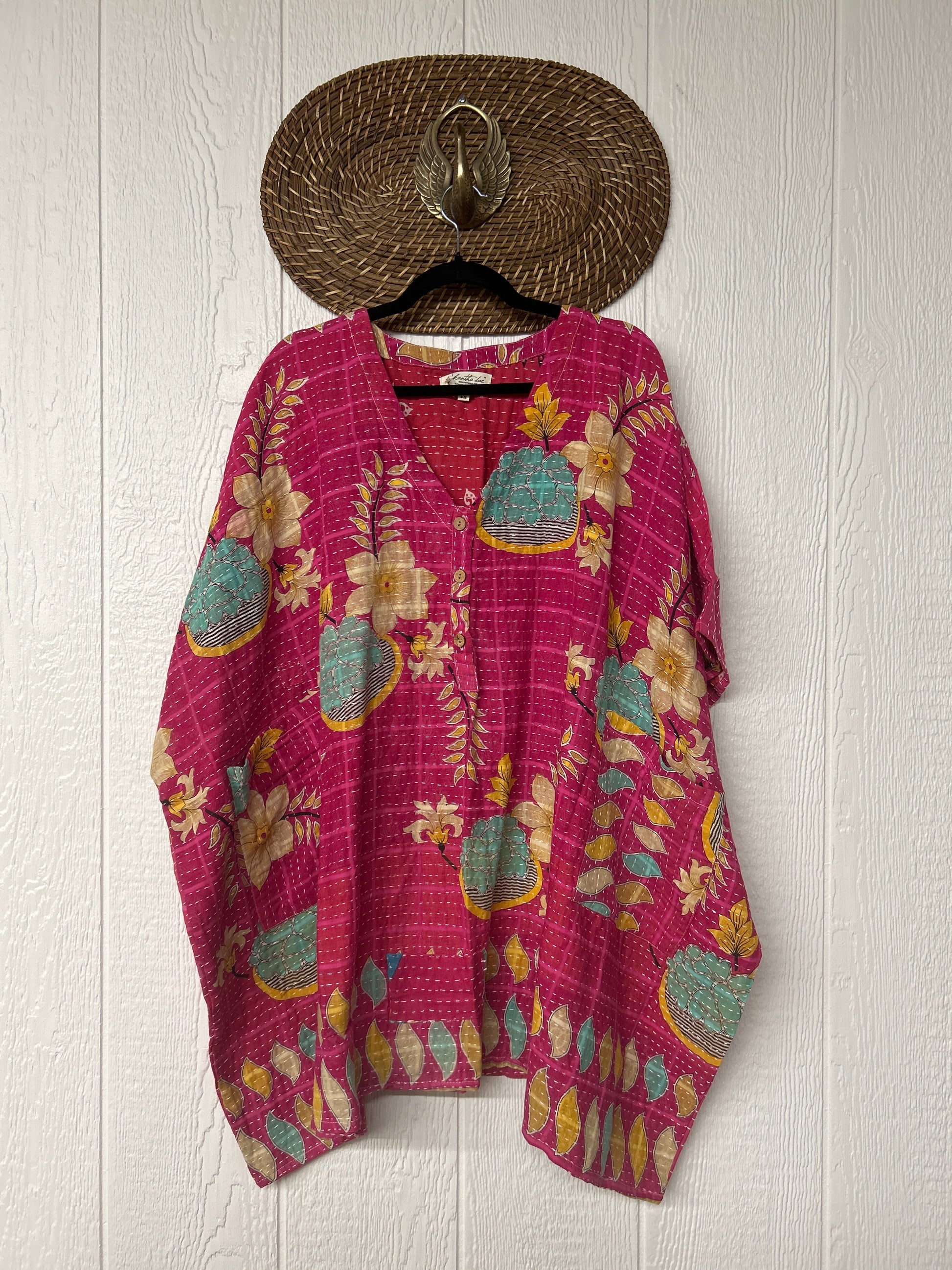 Crafted in our lux vintage kantha stitch cotton sari, this floaty muu is in a new mini length with buttons at the neckline and slouchy exterior pockets.