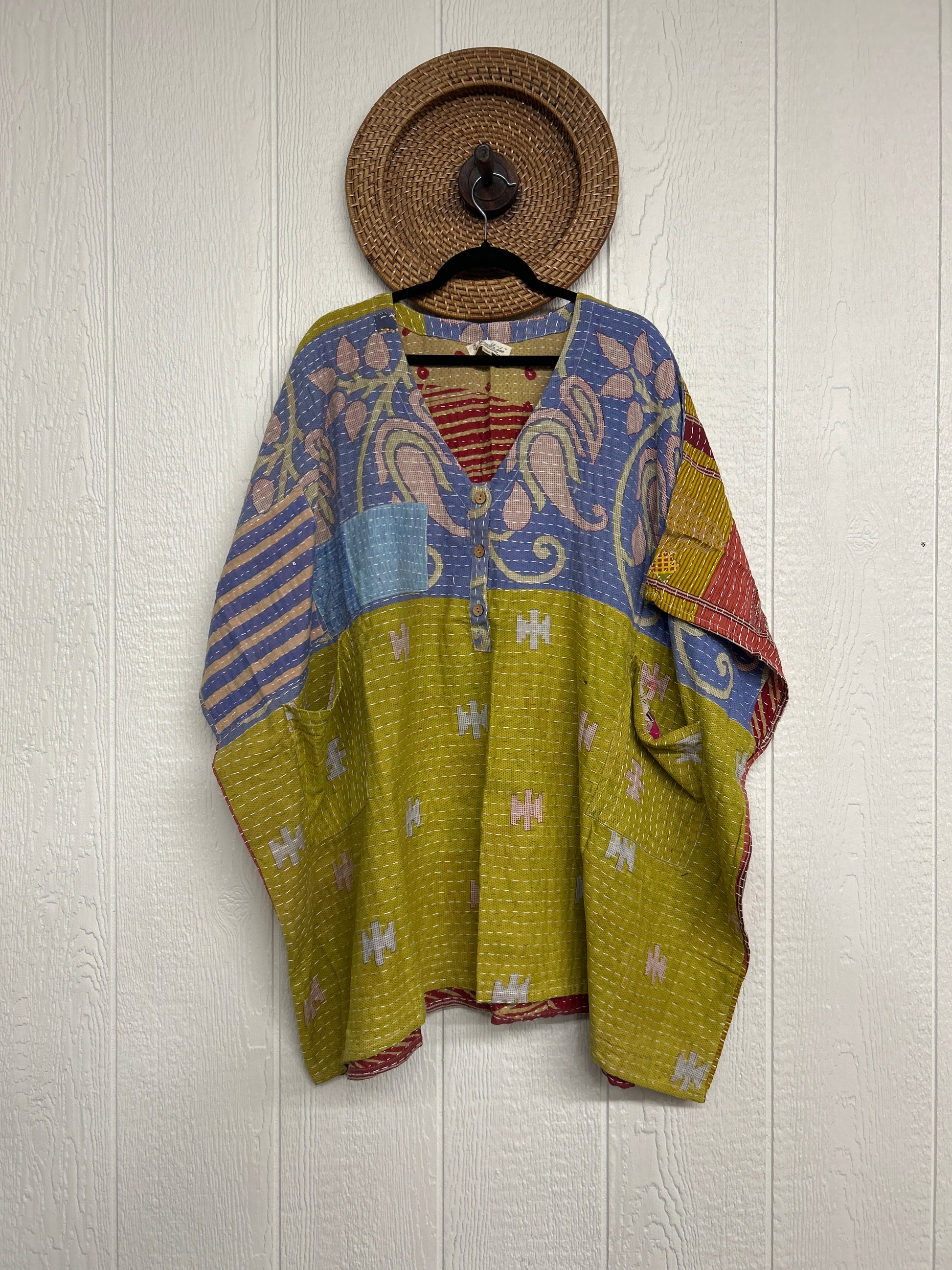Crafted in our lux vintage kantha stitch cotton sari, this floaty muu is in a new mini length with buttons at the neckline and slouchy exterior pockets.