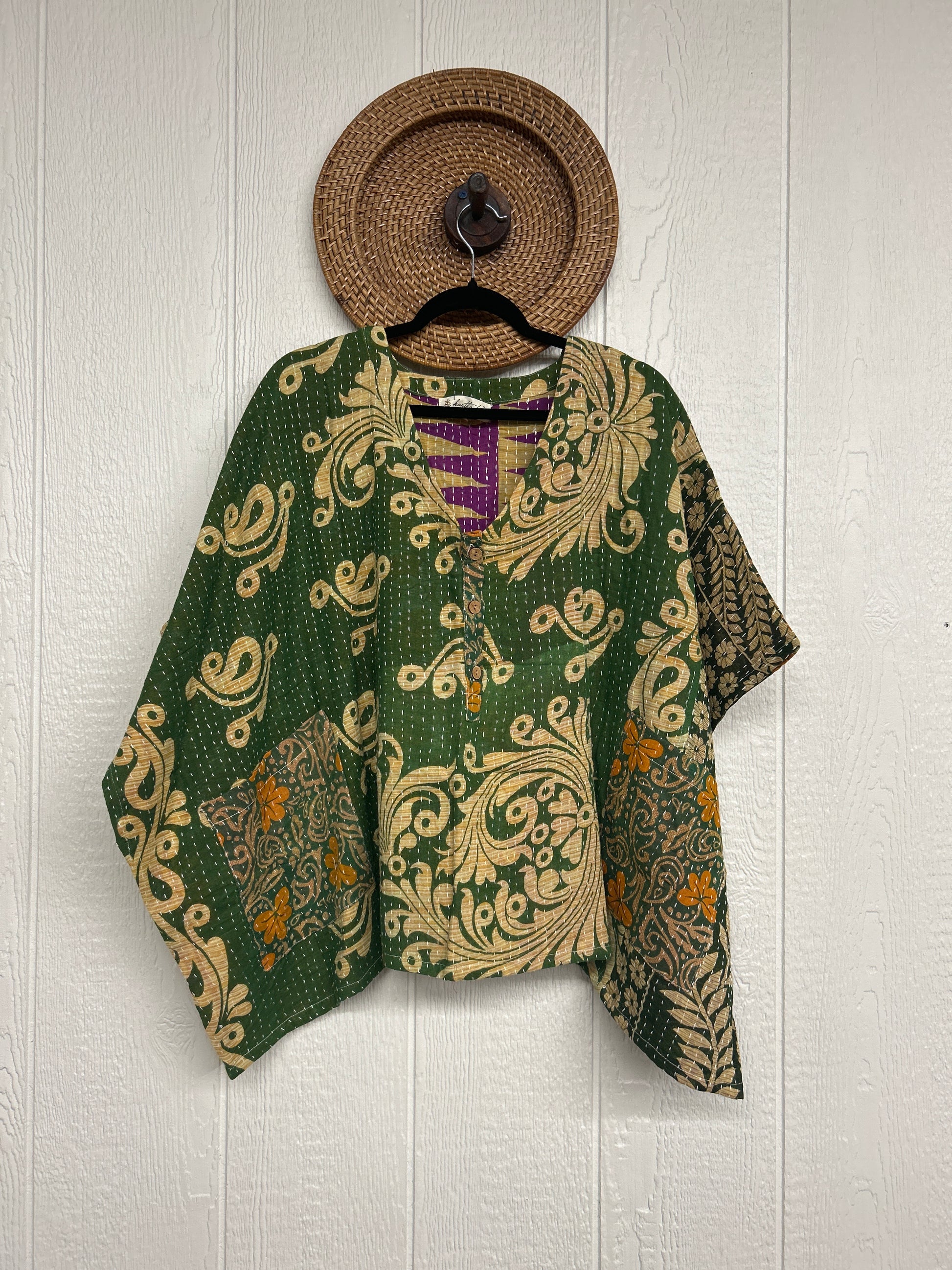 Made from our ultra luxe kantha stitch cotton sari, this effortless piece features 3 functional buttons and two slouchy pockets.