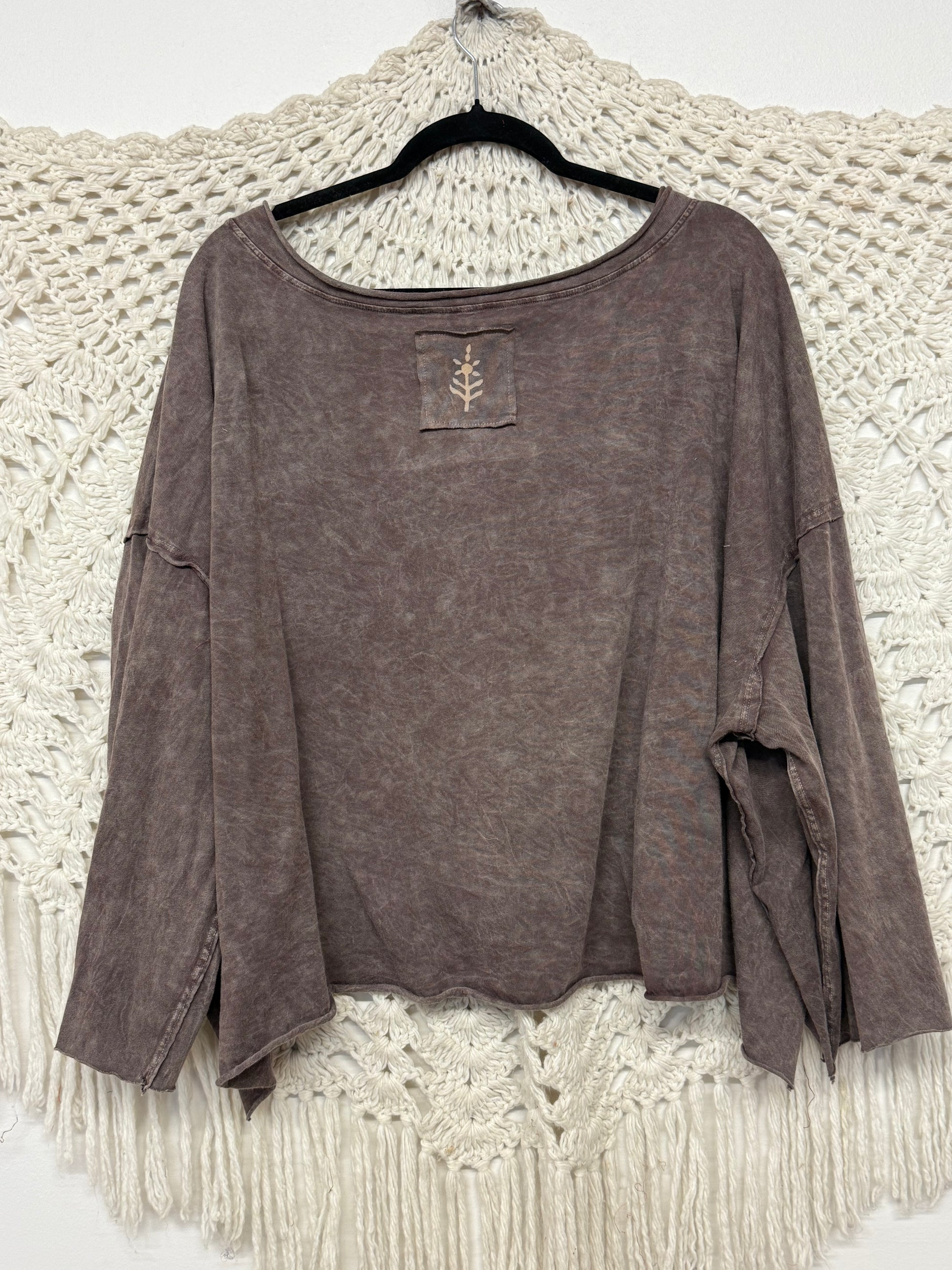 This longsleeve sleeve floaty crop silhouette features a v neckline, raw hem, a screen in the front and a branded KB patch logo on the back.
