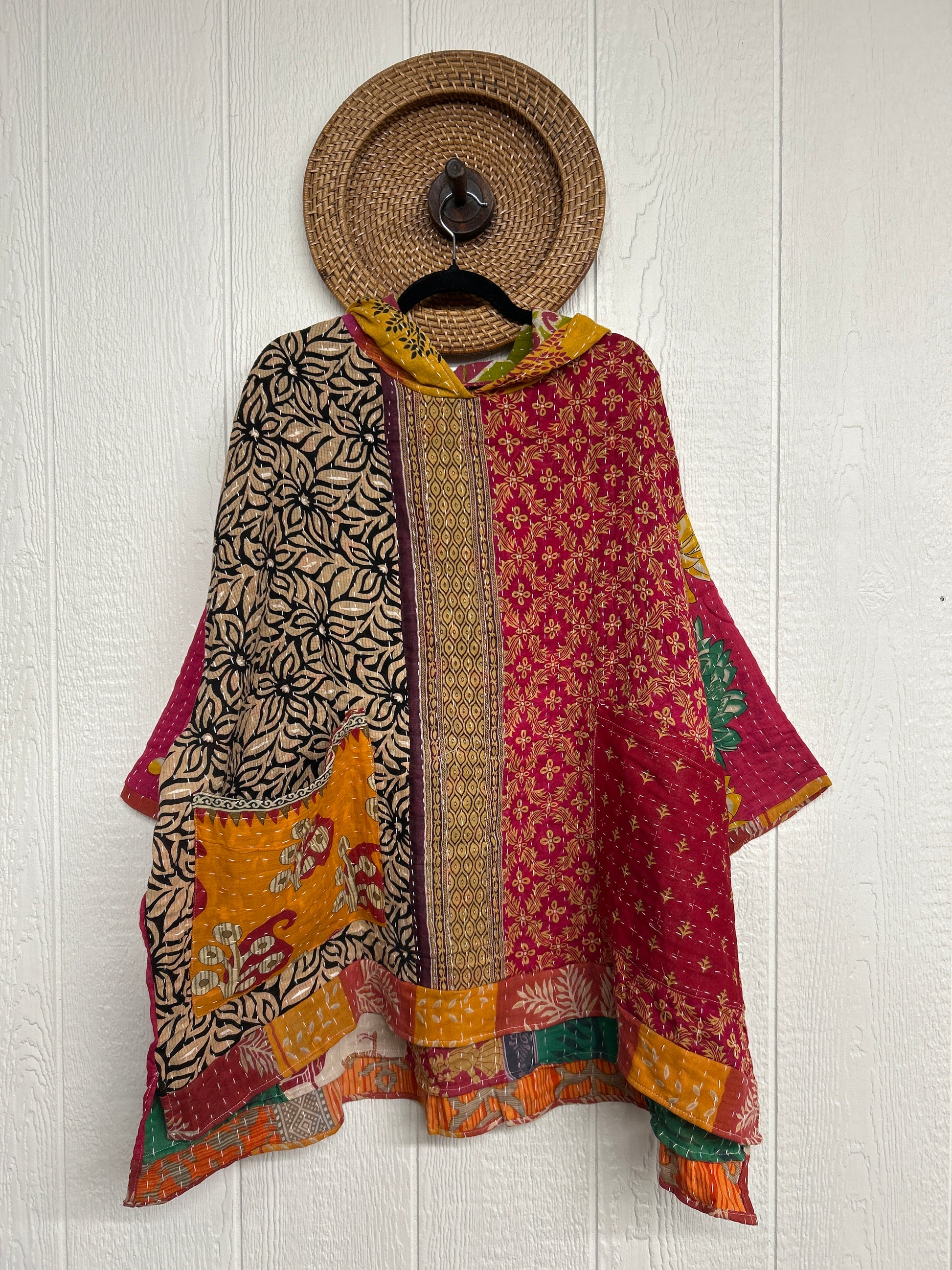 Crafted from koverlet kantha stitched cotton sari this slouchy hoodie features two exterior slouchy pockets for your treasures, a high low hem and hood.