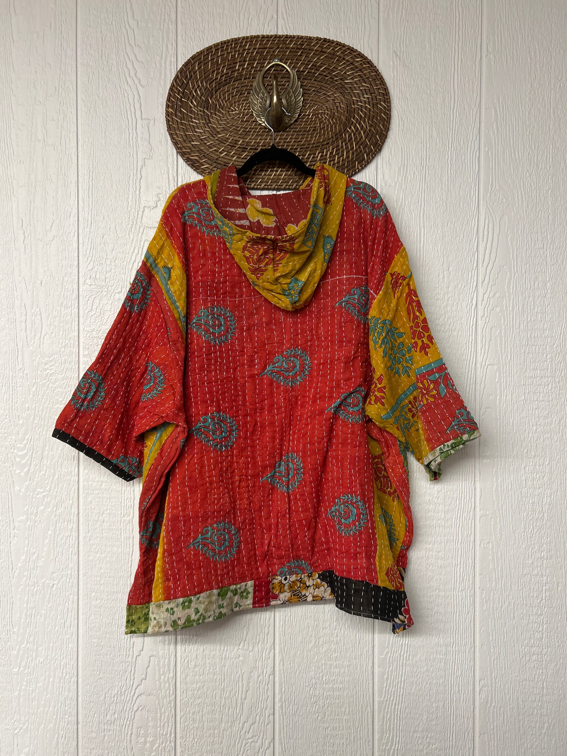 Crafted from koverlet kantha stitched cotton sari this slouchy hoodie features two exterior slouchy pockets for your treasures, a high low hem and hood.