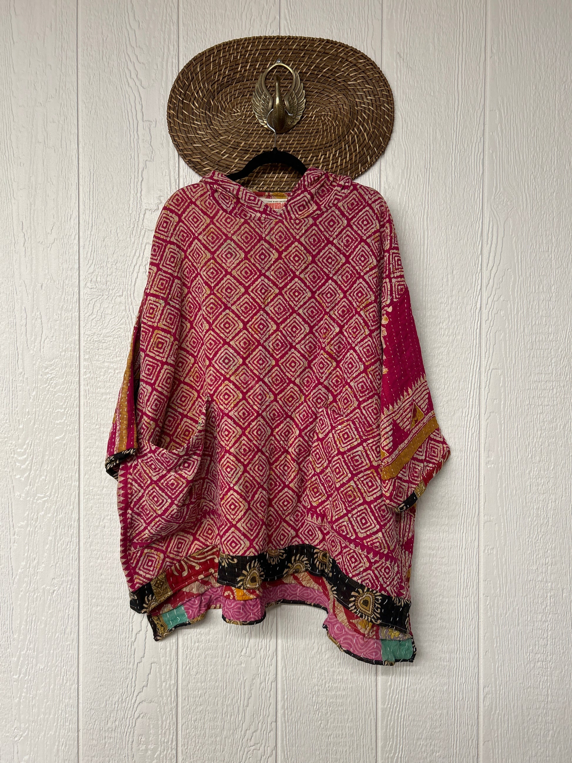 Crafted from koverlet kantha stitched cotton sari this slouchy hoodie features two exterior slouchy pockets for your treasures, a high low hem and hood.