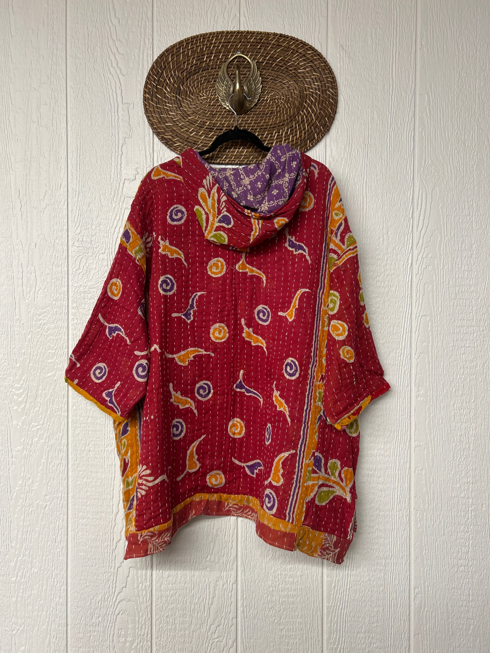 Crafted from koverlet kantha stitched cotton sari this slouchy hoodie features two exterior slouchy pockets for your treasures, a high low hem and hood.