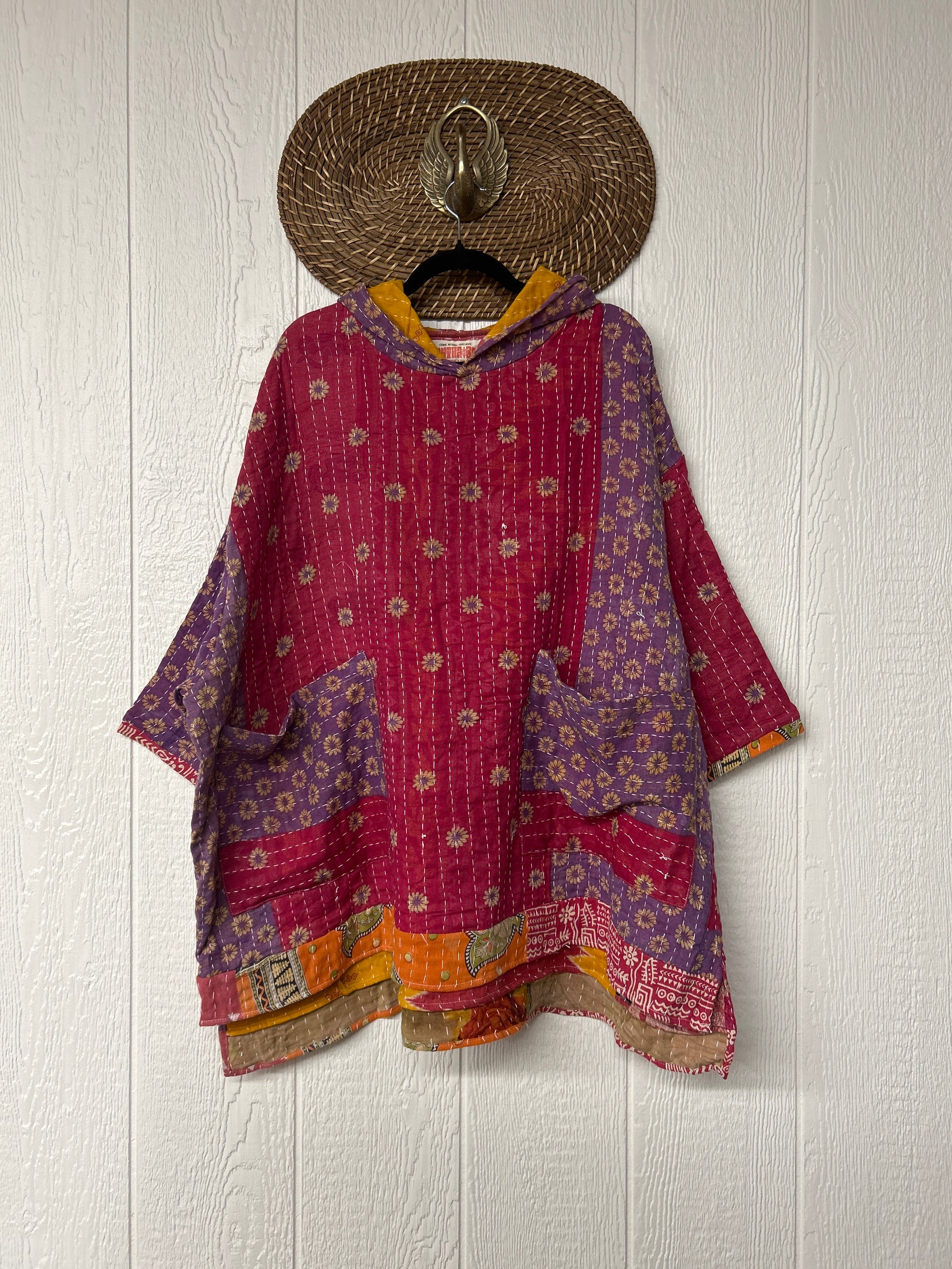 Crafted from koverlet kantha stitched cotton sari this slouchy hoodie features two exterior slouchy pockets for your treasures, a high low hem and hood.