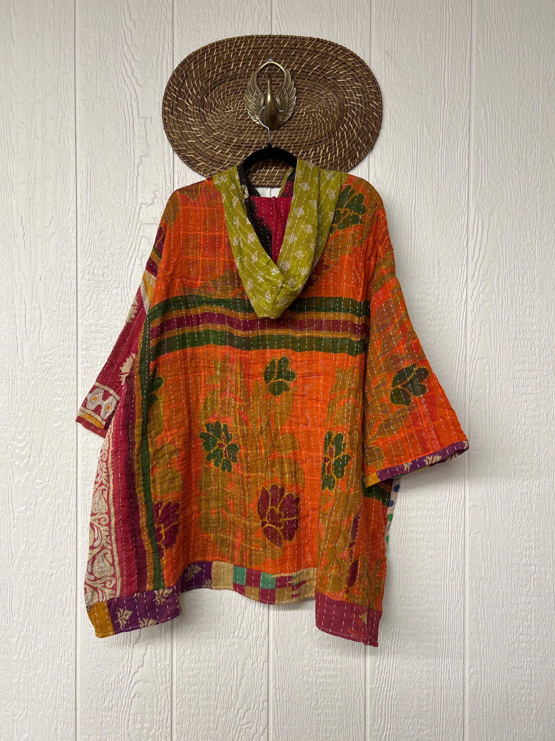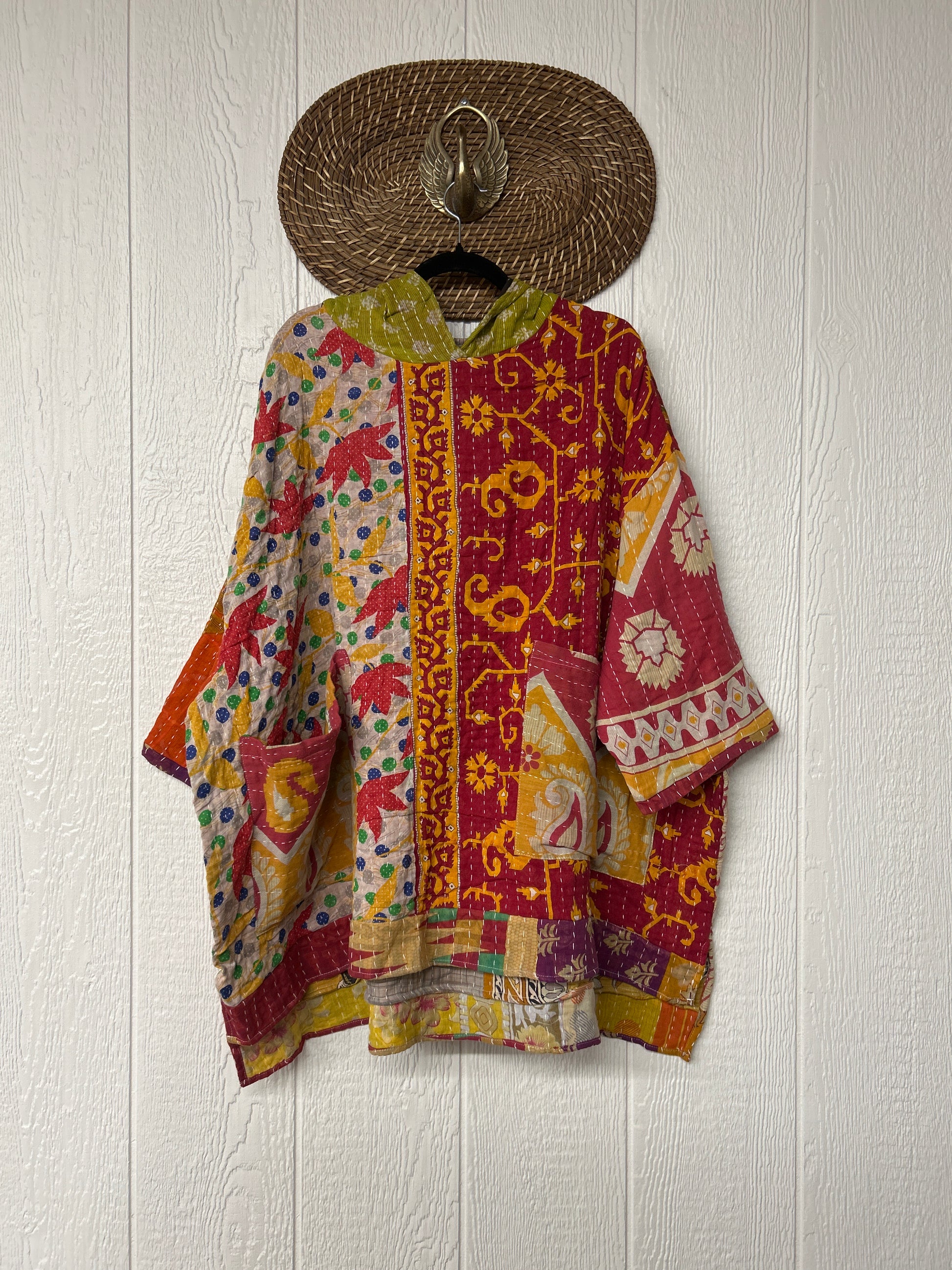 Crafted from koverlet kantha stitched cotton sari this slouchy hoodie features two exterior slouchy pockets for your treasures, a high low hem and hood.