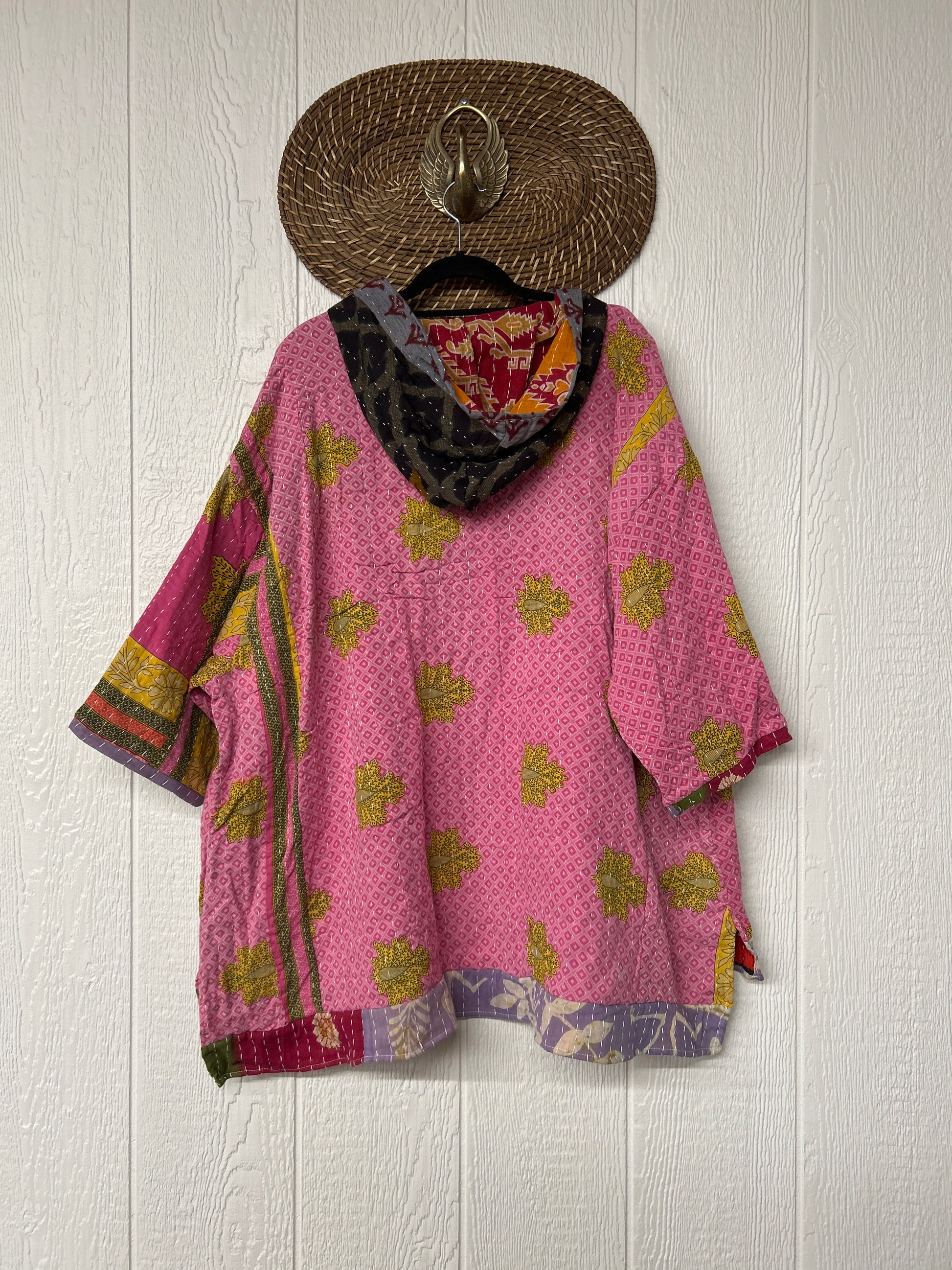 Crafted from koverlet kantha stitched cotton sari this slouchy hoodie features two exterior slouchy pockets for your treasures, a high low hem and hood.