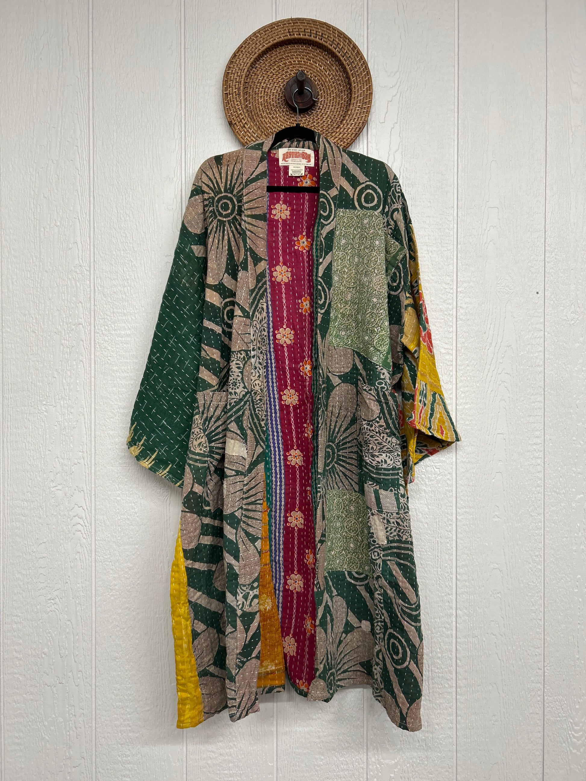 Crafted from our ultra lux vintage Kantha stitched vintage cotton sari our dreamweaver robe features a tie closure, two slouchy exterior pockets for your treasures and groovy bell sleeves. This dream piece can be dressed up or down depending on your vibe!