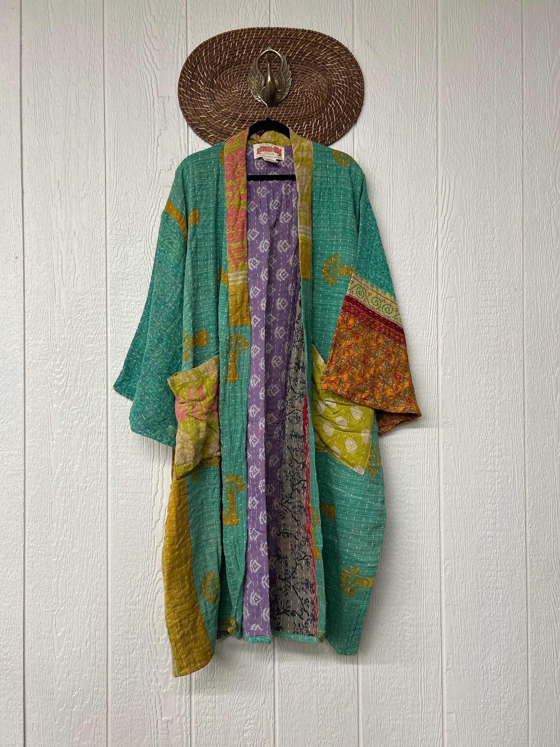 Crafted from our ultra lux vintage Kantha stitched vintage cotton sari our dreamweaver robe features a tie closure, two slouchy exterior pockets for your treasures and groovy bell sleeves. This dream piece can be dressed up or down depending on your vibe!