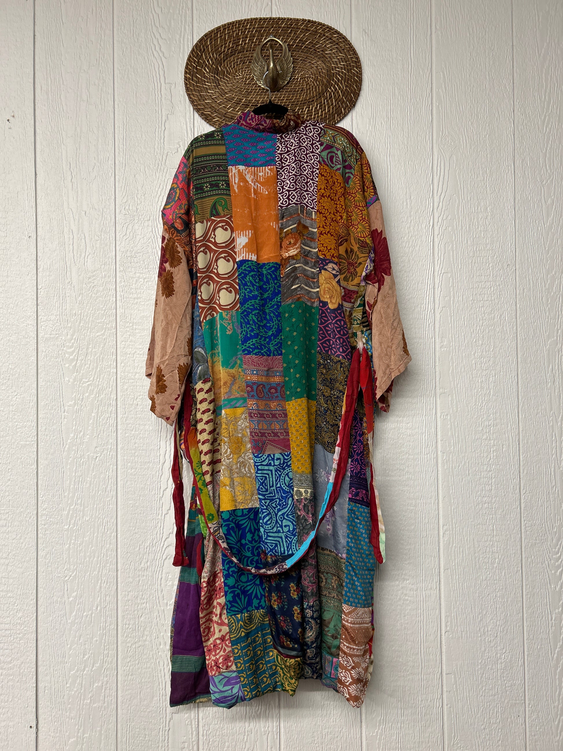 Patchwork outer garment is made from rasgulla and crepe sari and fully lined in printed cotton sari. Features slouchy outer pockets and a tie sash closure. Wide sleeves are crafted from unlined crepe silk for extra dimension.