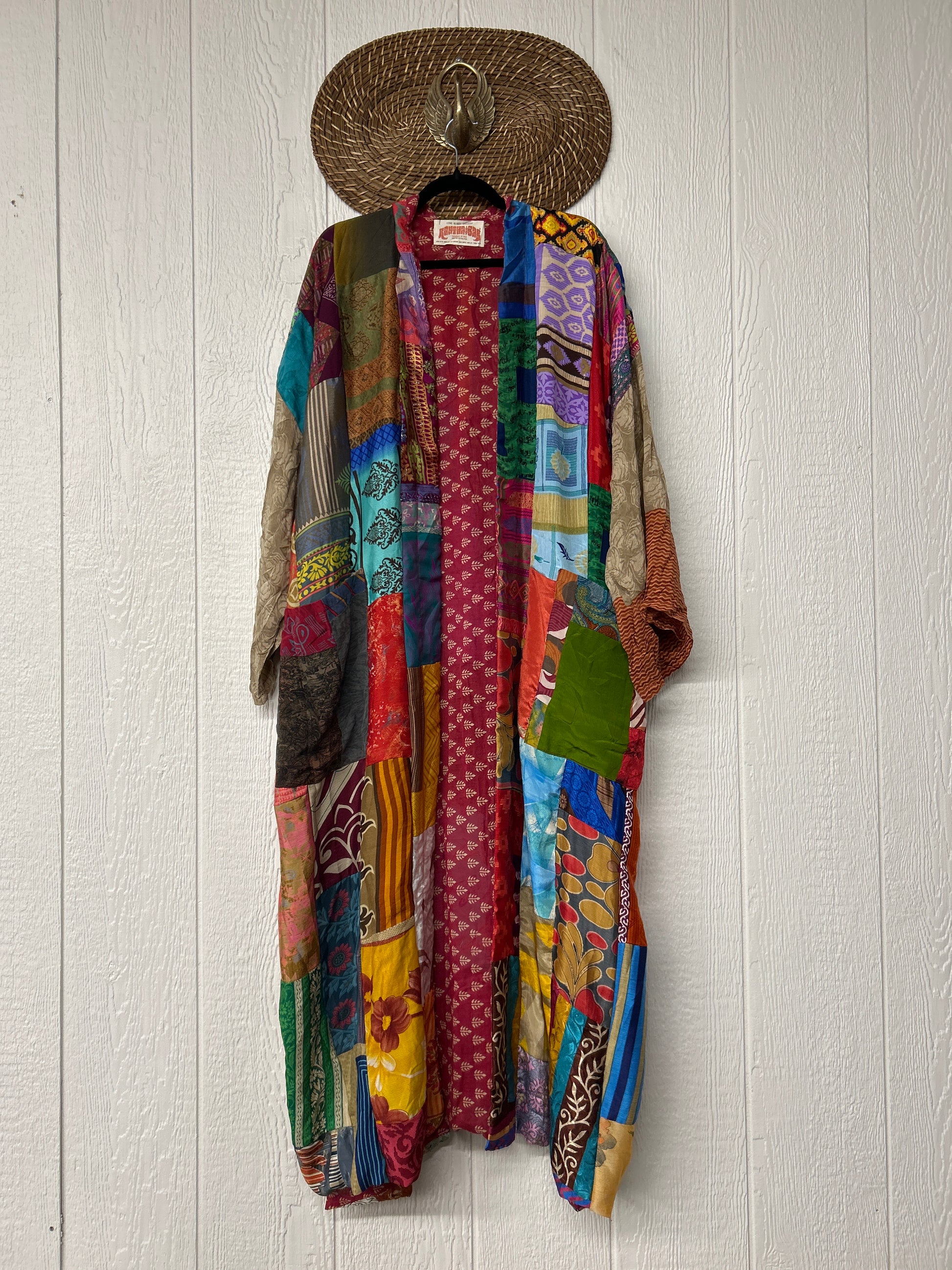 Patchwork outer garment is made from rasgulla and crepe sari and fully lined in printed cotton sari. Features slouchy outer pockets and a tie sash closure. Wide sleeves are crafted from unlined crepe silk for extra dimension.