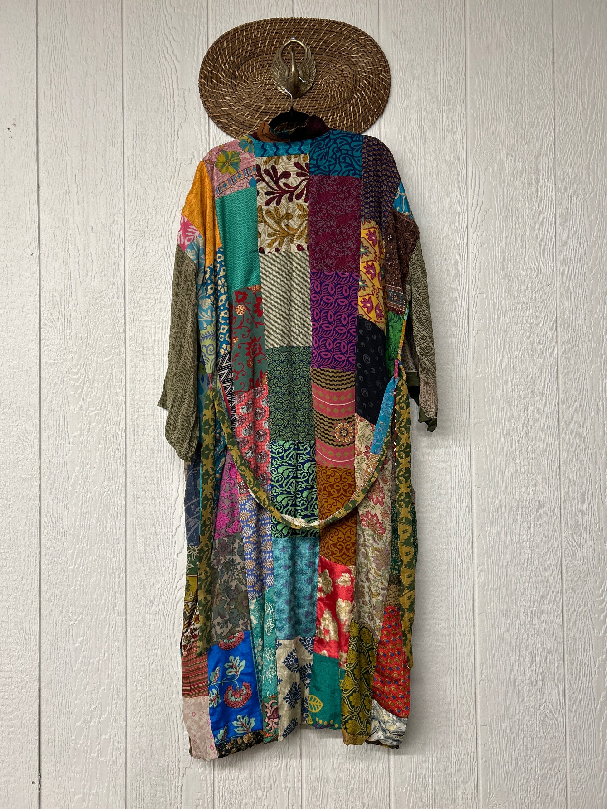 Patchwork outer garment is made from rasgulla and crepe sari and fully lined in printed cotton sari. Features slouchy outer pockets and a tie sash closure. Wide sleeves are crafted from unlined crepe silk for extra dimension.