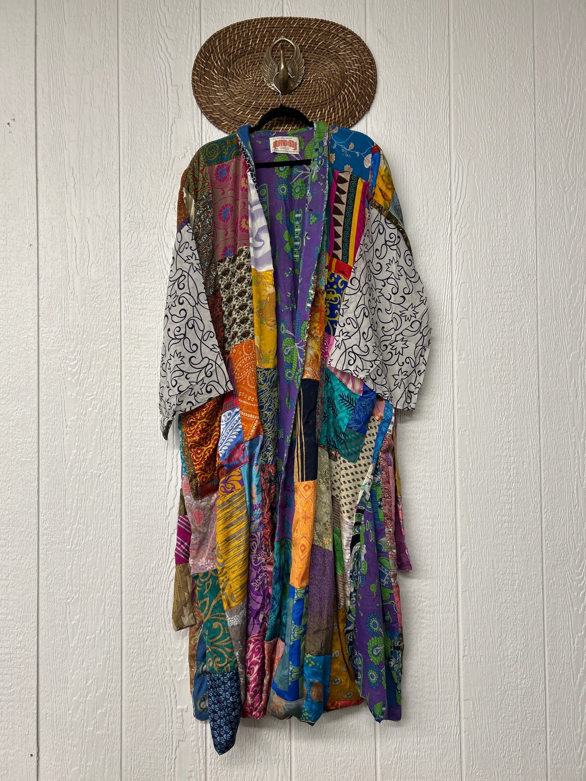 Patchwork outer garment is made from rasgulla and crepe sari and fully lined in printed cotton sari. Features slouchy outer pockets and a tie sash closure. Wide sleeves are crafted from unlined crepe silk for extra dimension.