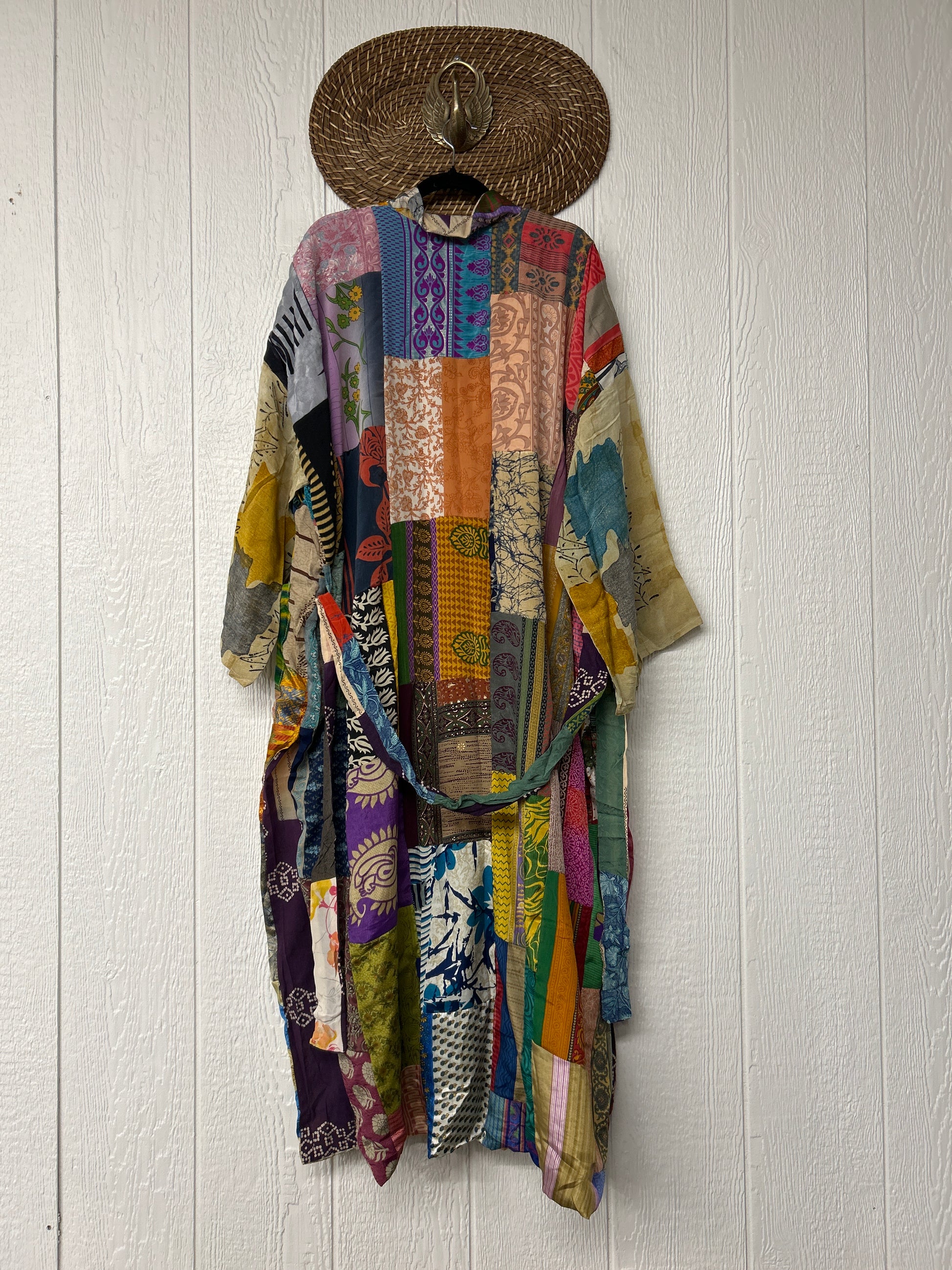 Patchwork outer garment is made from rasgulla and crepe sari and fully lined in printed cotton sari. Features slouchy outer pockets and a tie sash closure. Wide sleeves are crafted from unlined crepe silk for extra dimension.