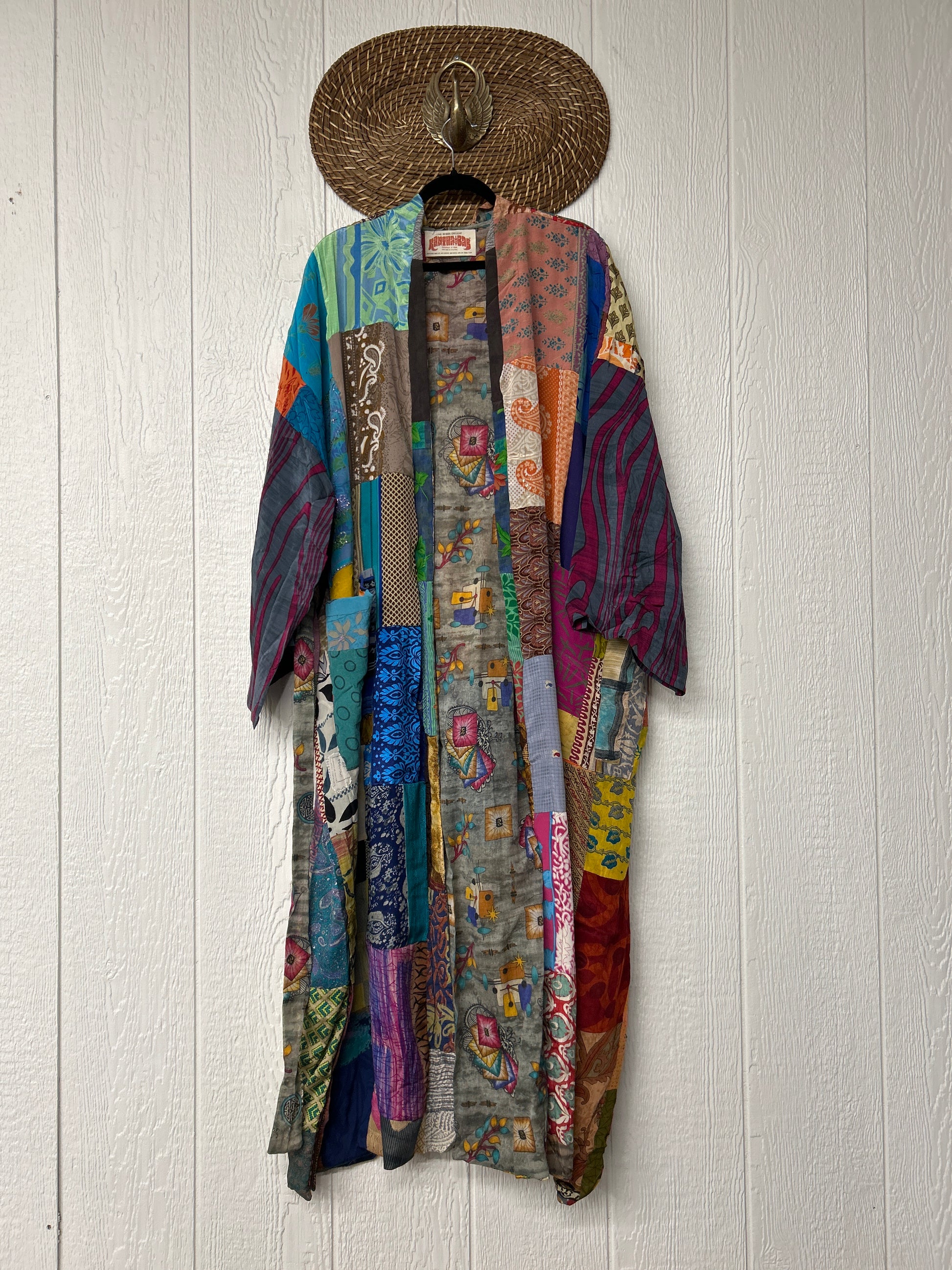 Patchwork outer garment is made from rasgulla and crepe sari and fully lined in printed cotton sari. Features slouchy outer pockets and a tie sash closure. Wide sleeves are crafted from unlined crepe silk for extra dimension.