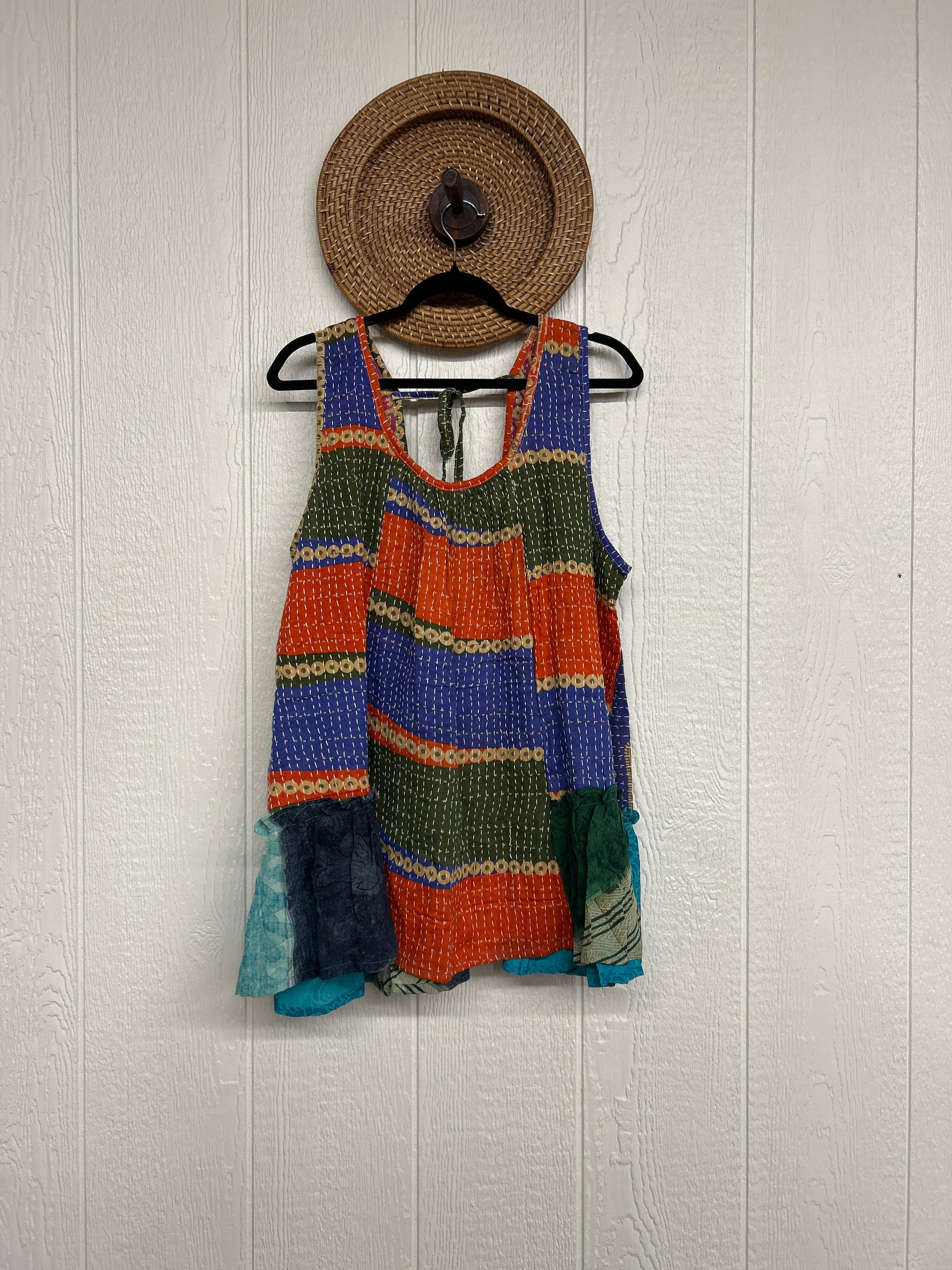 Made from a dreamy combo of our ultra lux cotton kantha stitch sari and crepe silk sari, the Mystic Tunic features a tie back on the shoulder to make it fully customizable.