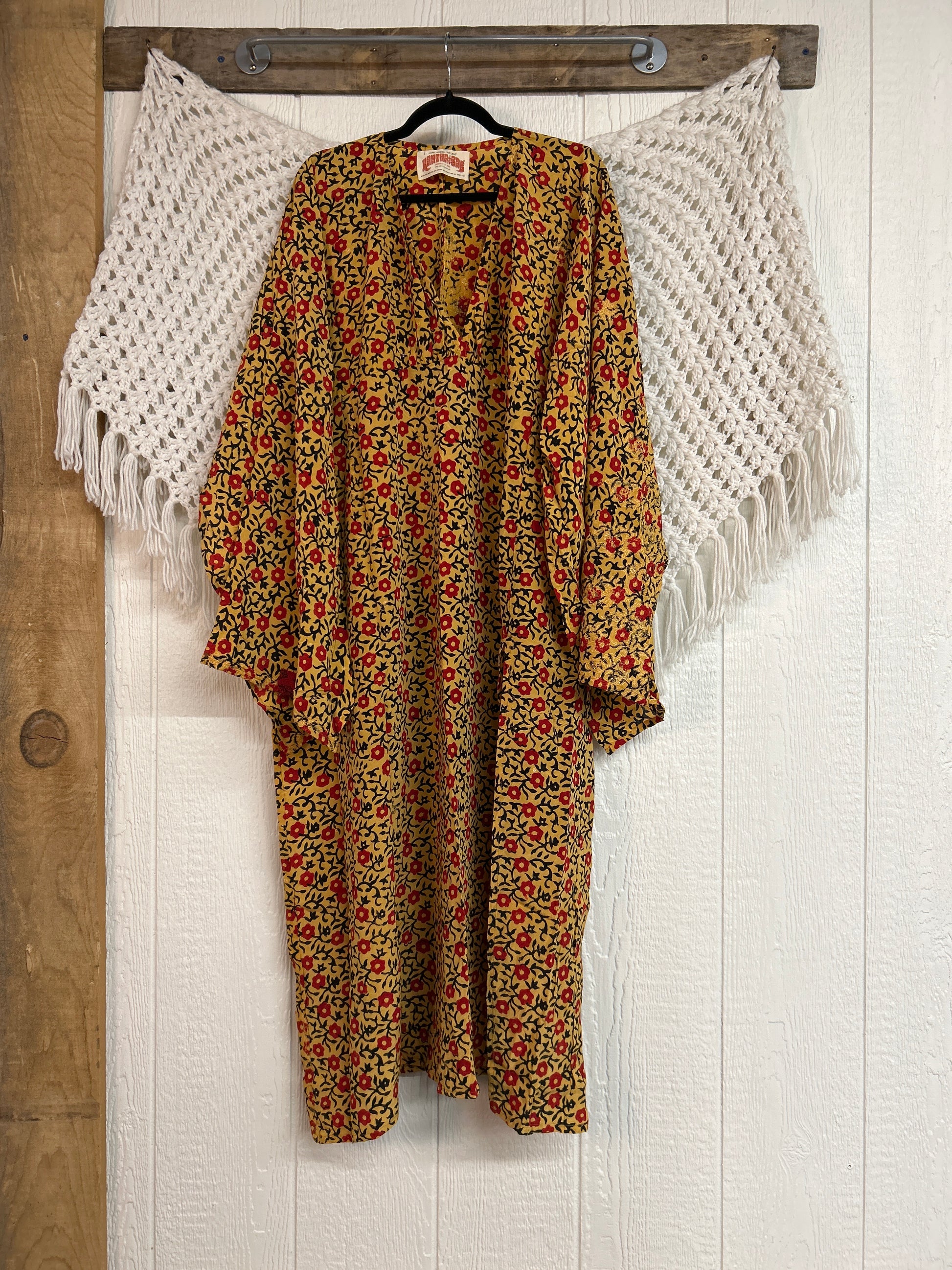 Crafted from our ultra lux vintage crepe sari this floaty dream features wide bell sleeves, deep v neckline, maxi silhouette with side slits for extra dimension.