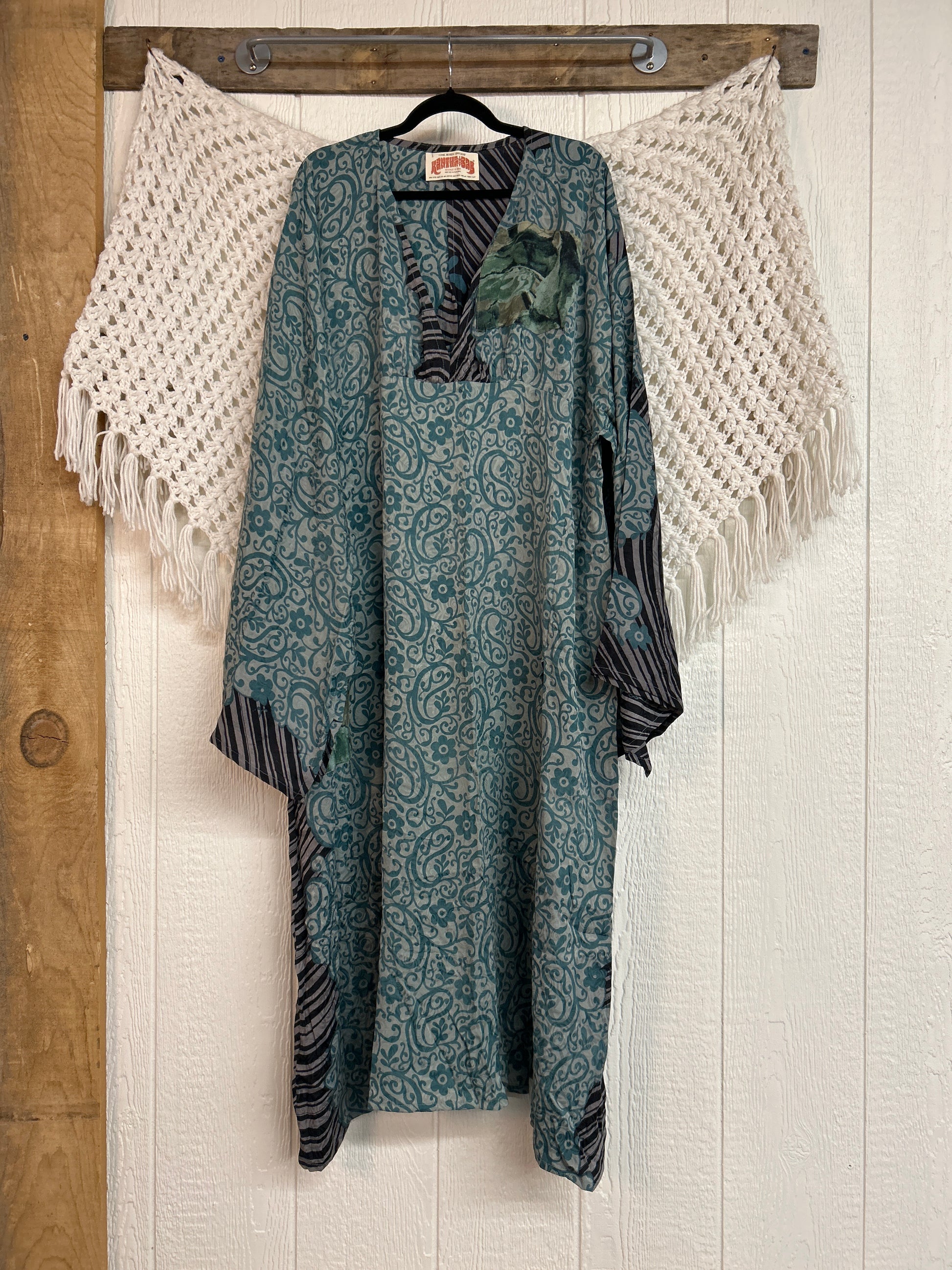 Crafted from our ultra lux vintage crepe sari this floaty dream features wide bell sleeves, deep v neckline, maxi silhouette with side slits for extra dimension.
