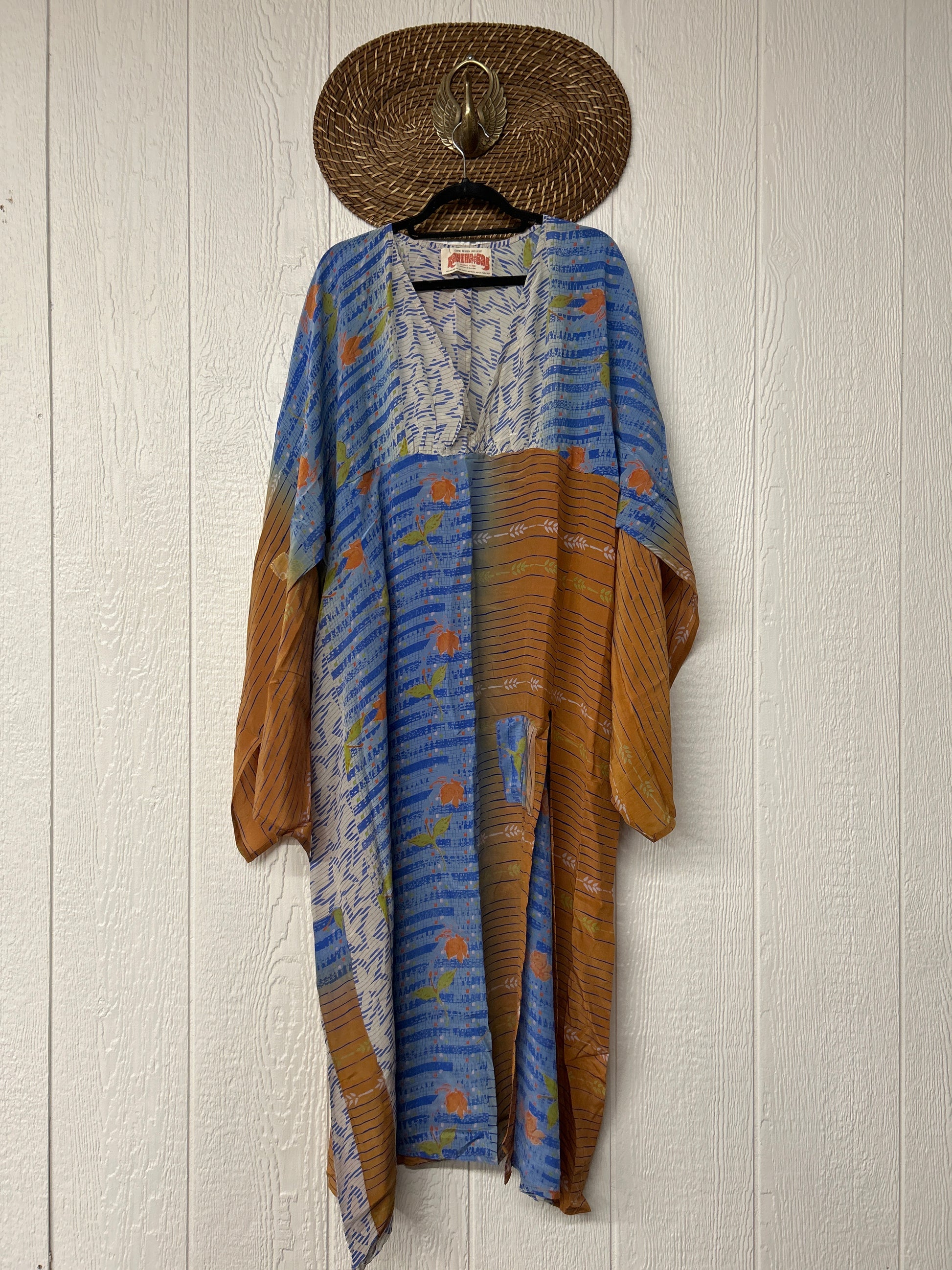 Fabrics may have small threads or holes in the layers. Color inconsistency or small stains may be present. The saris are sewn together and extend the life of each design.