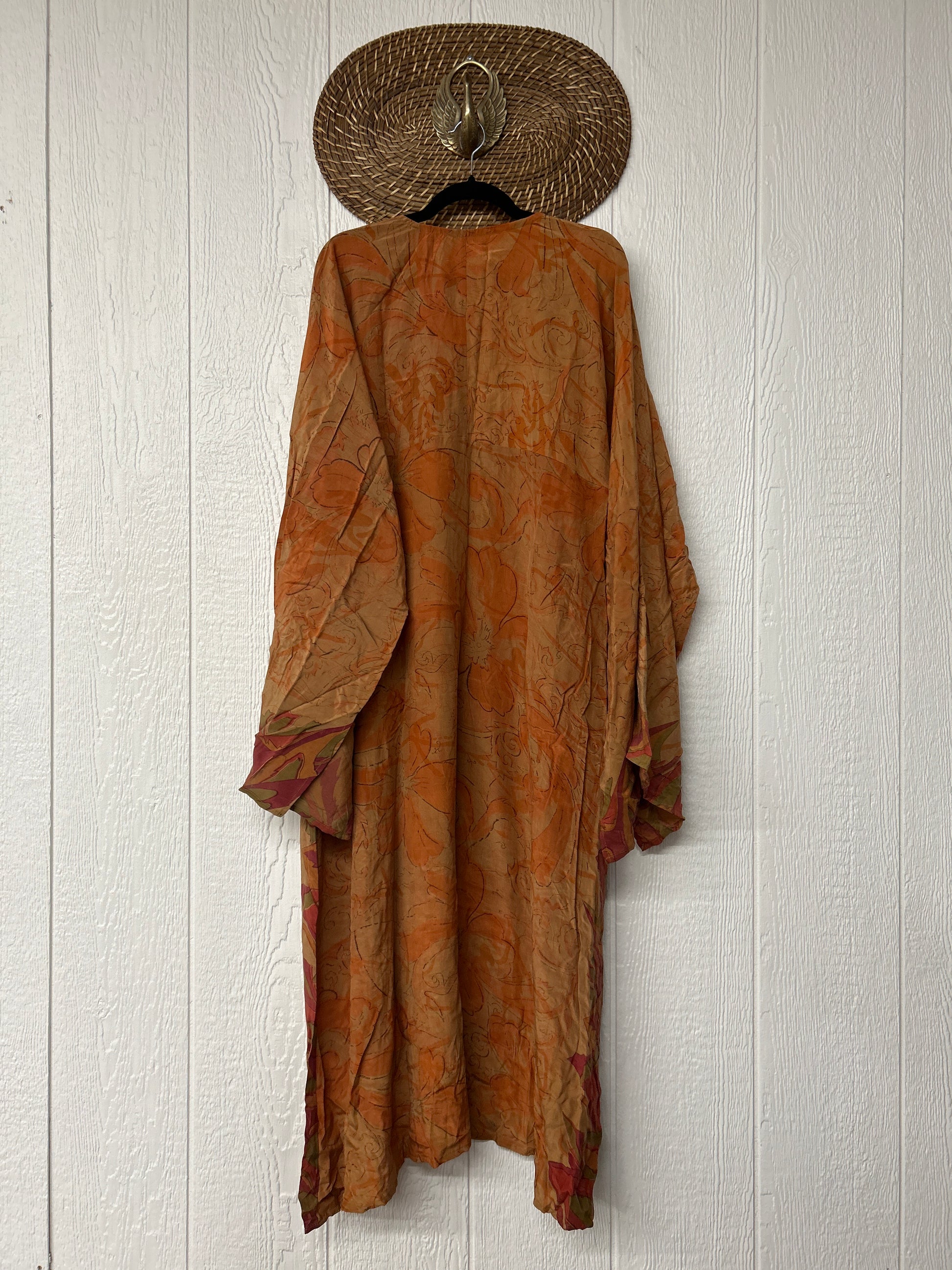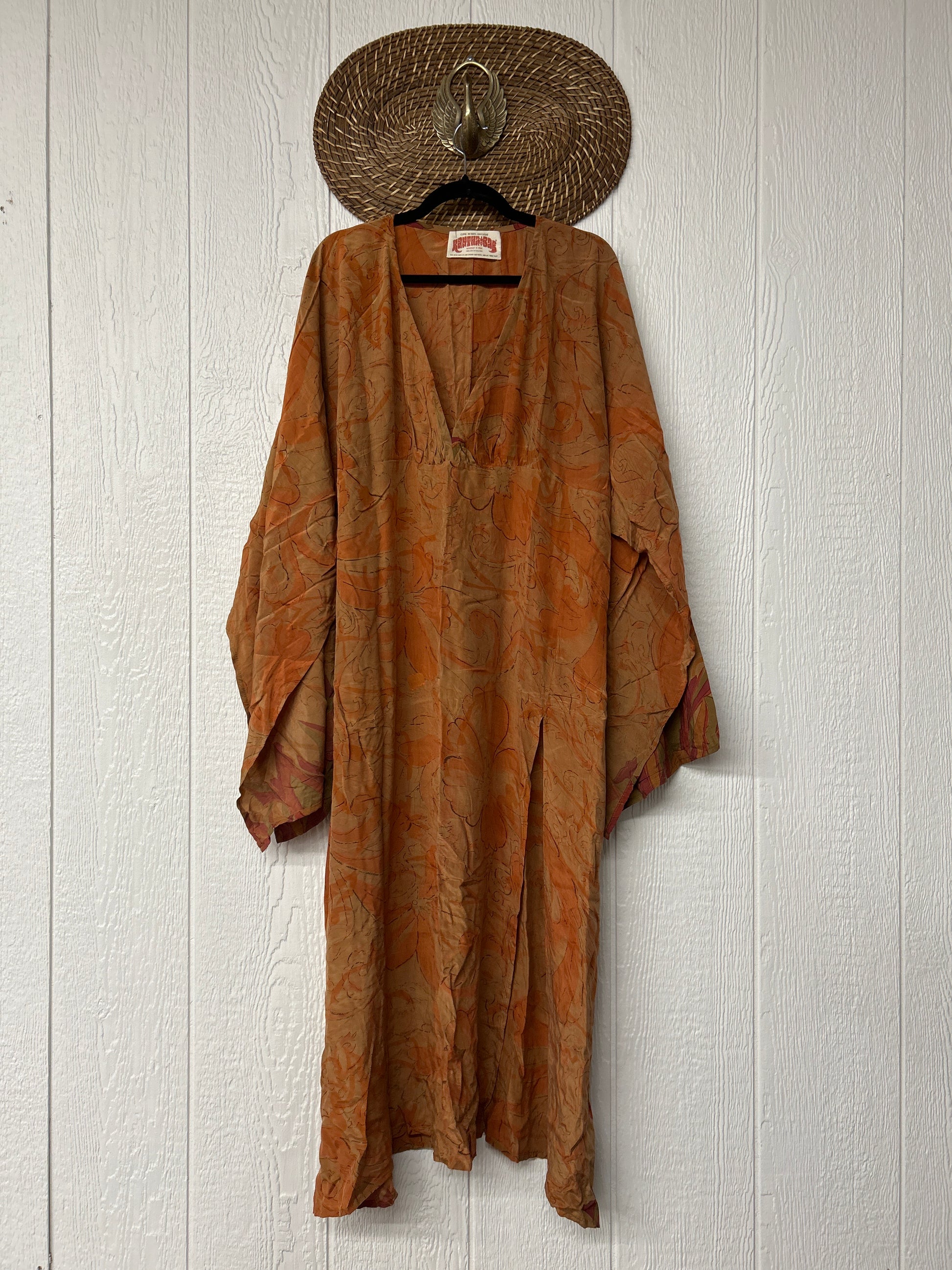 Crafted from our ultra lux vintage crepe sari this floaty dream features wide bell sleeves, deep v neckline, maxi silhouette with side slits for extra dimension.