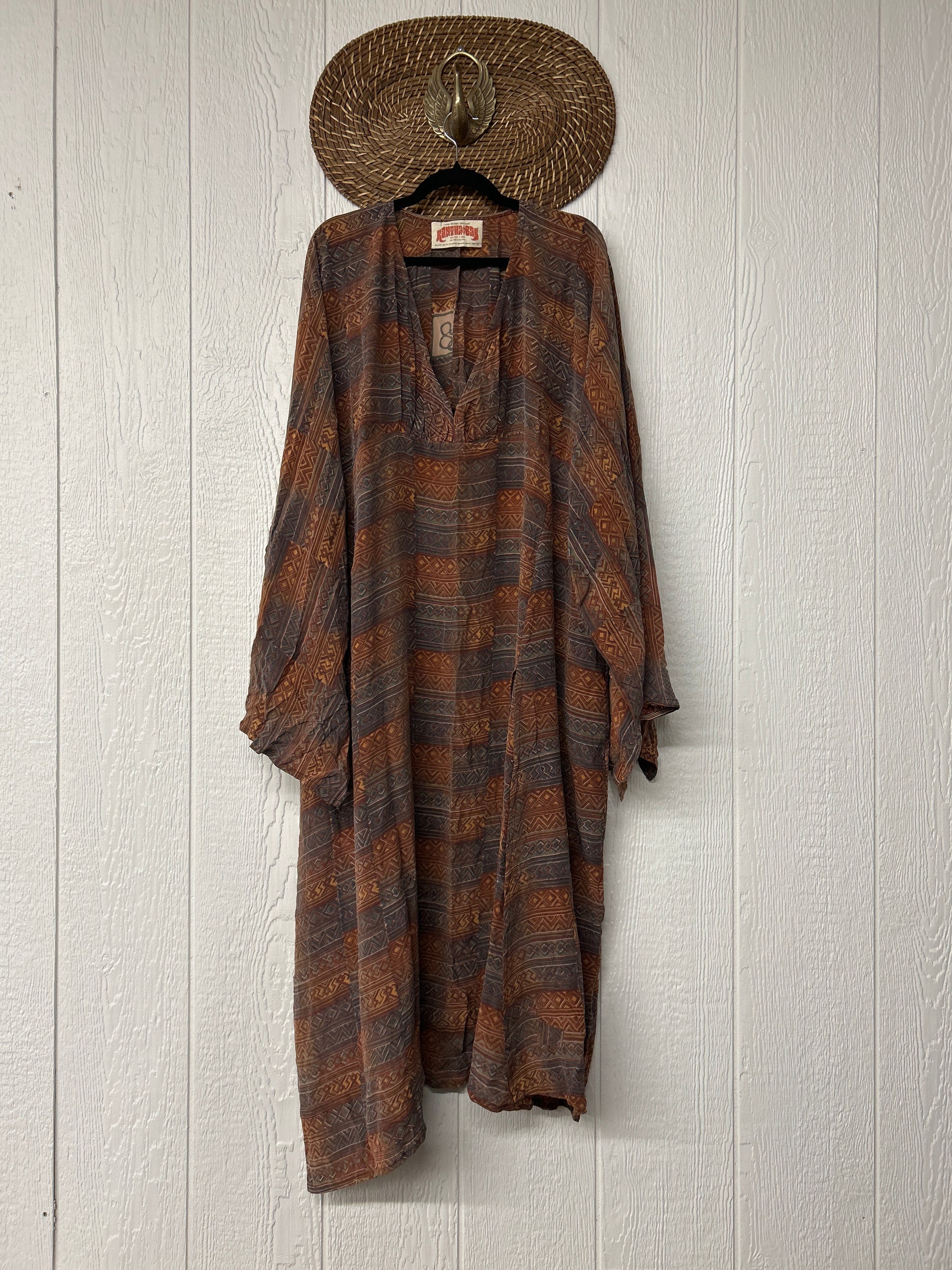 Crafted from our ultra lux vintage crepe sari this floaty dream features wide bell sleeves, deep v neckline, maxi silhouette with side slits for extra dimension.