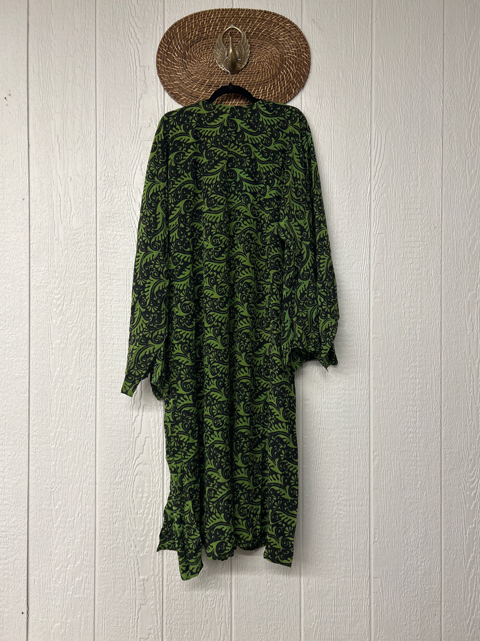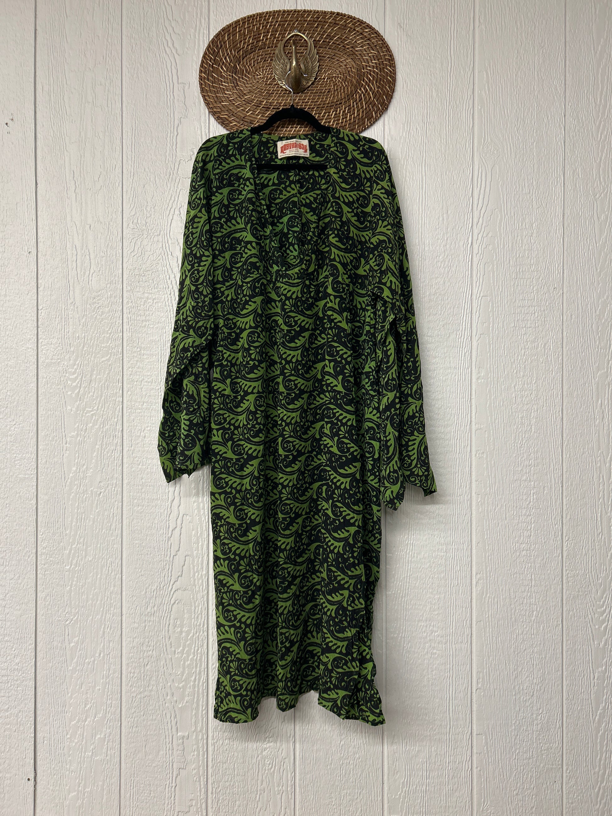 Crafted from our ultra lux vintage crepe sari this floaty dream features wide bell sleeves, deep v neckline, maxi silhouette with side slits for extra dimension.