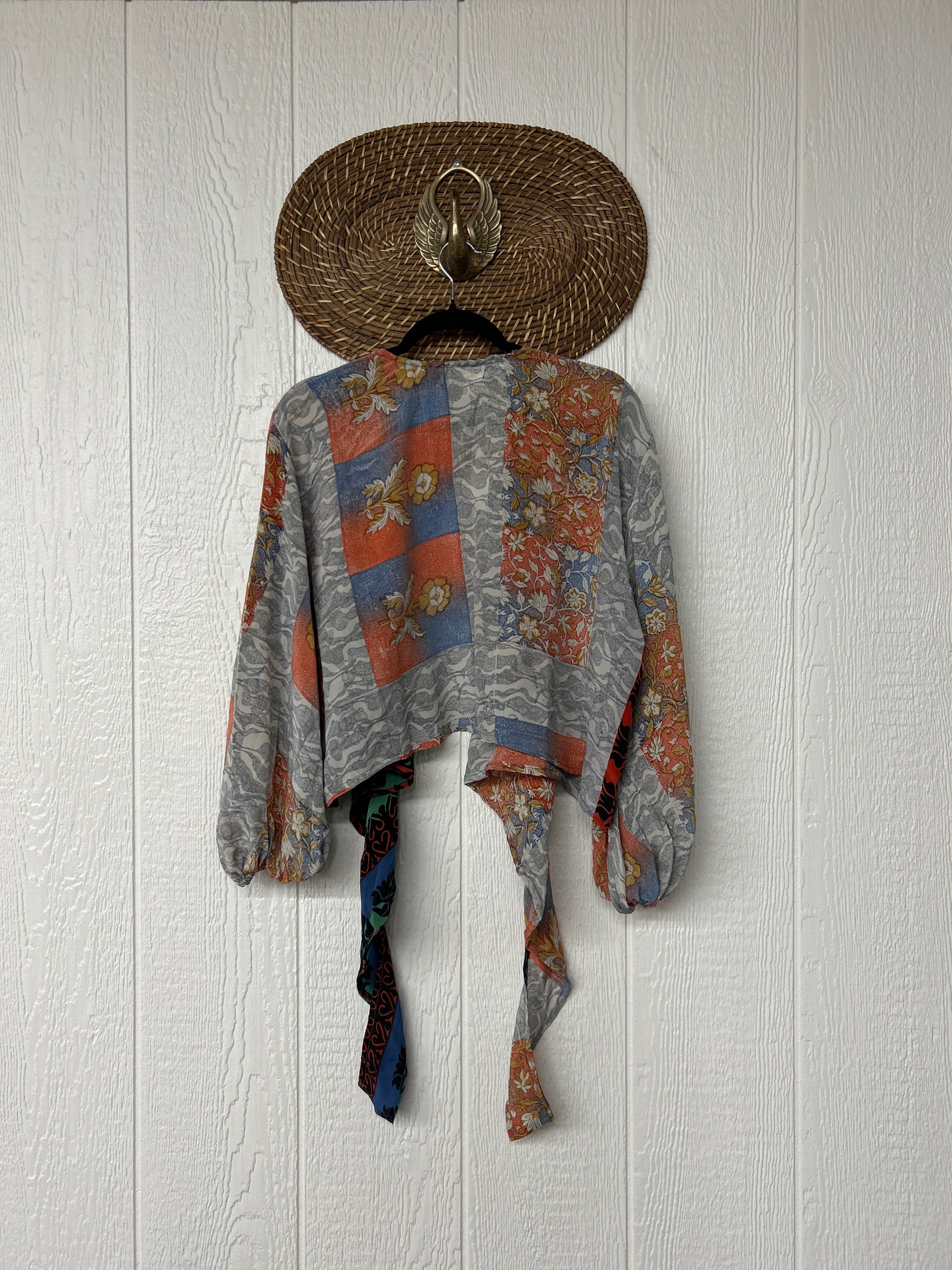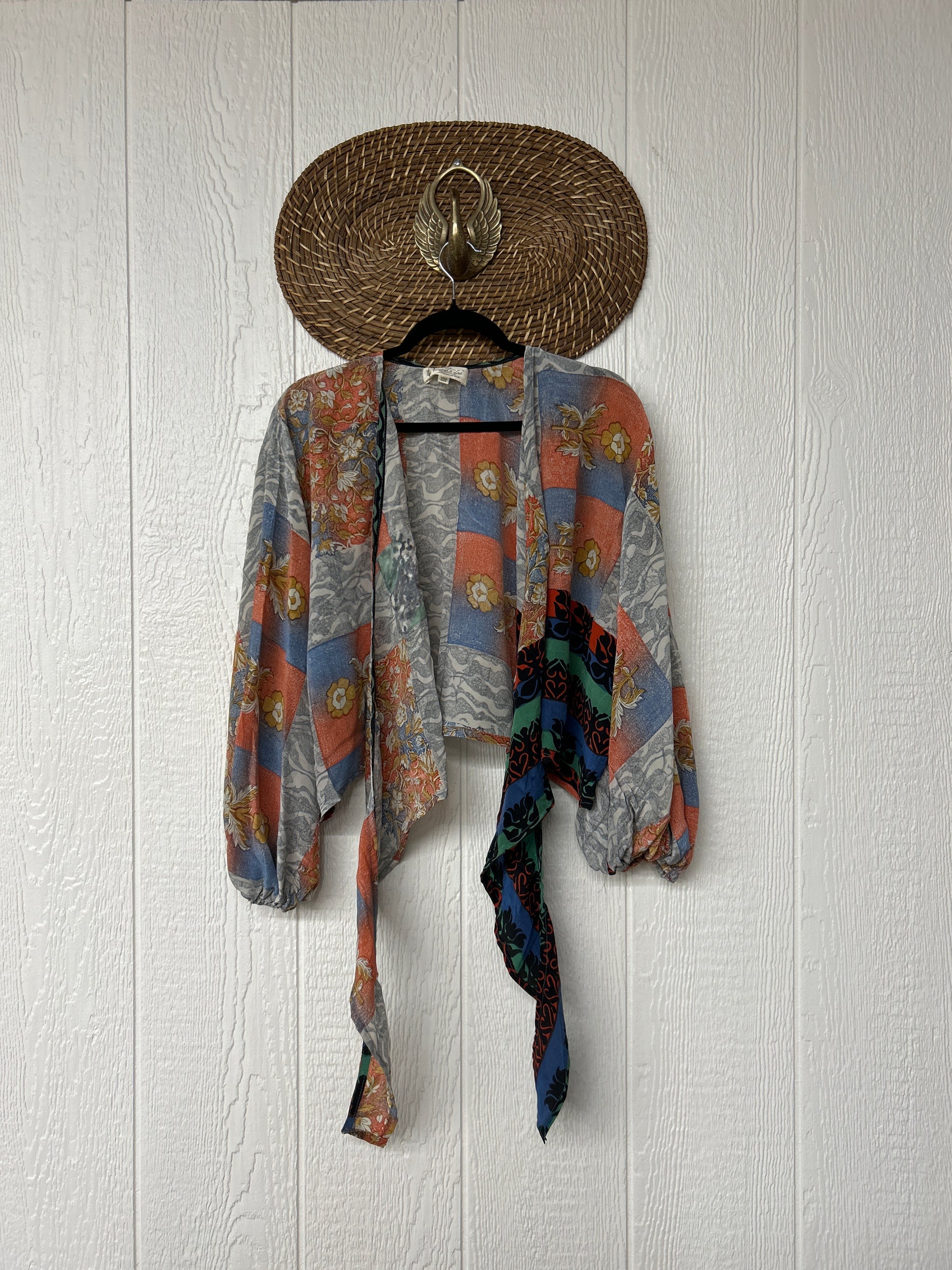 Crafted from vintage crepe silk sari this floaty layer features bounce bell sleeves and a tie closure long enough to wrap around your body. We know this will be one of your new favorites.