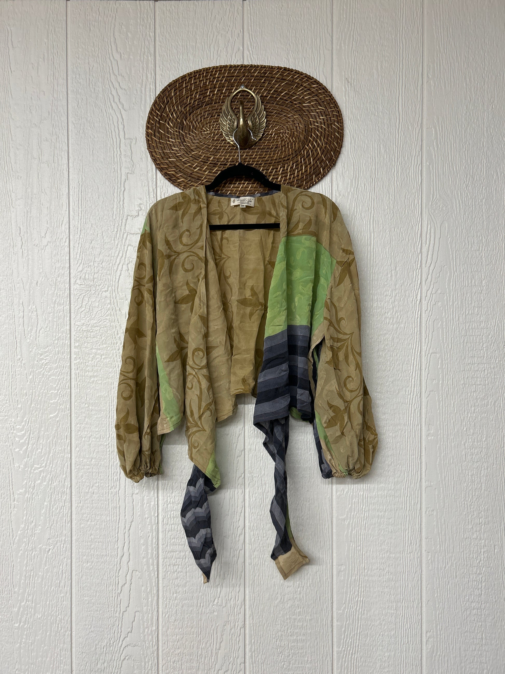 Crafted from vintage crepe silk sari this floaty layer features bounce bell sleeves and a tie closure long enough to wrap around your body. We know this will be one of your new favorites.