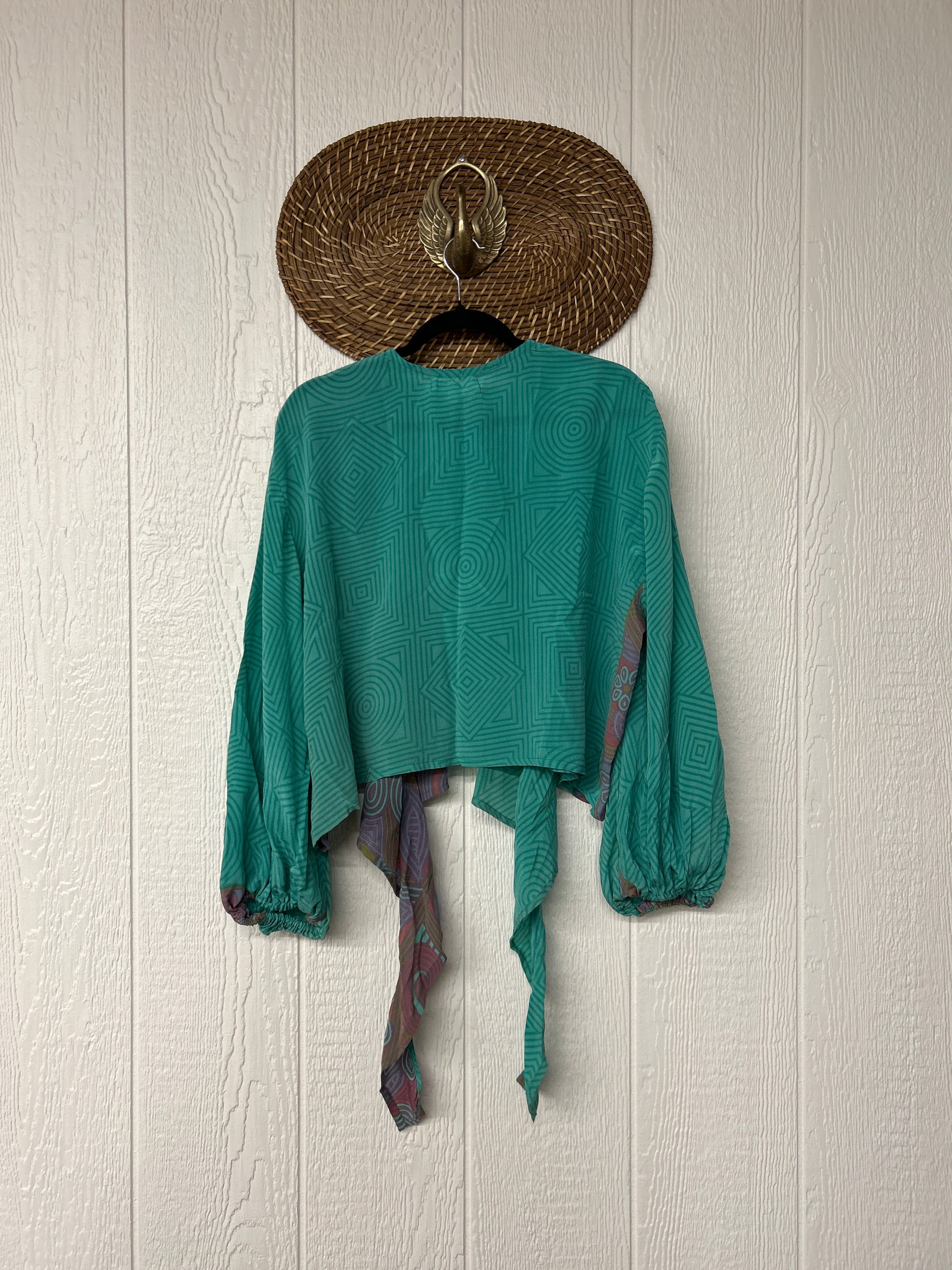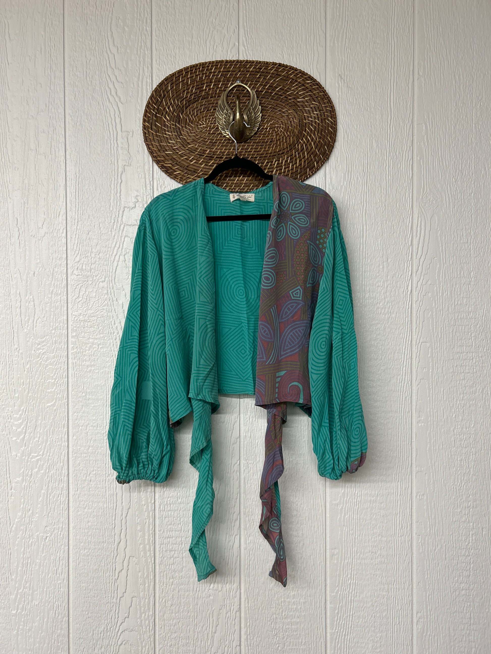 Crafted from vintage crepe silk sari this floaty layer features bounce bell sleeves and a tie closure long enough to wrap around your body. We know this will be one of your new favorites.