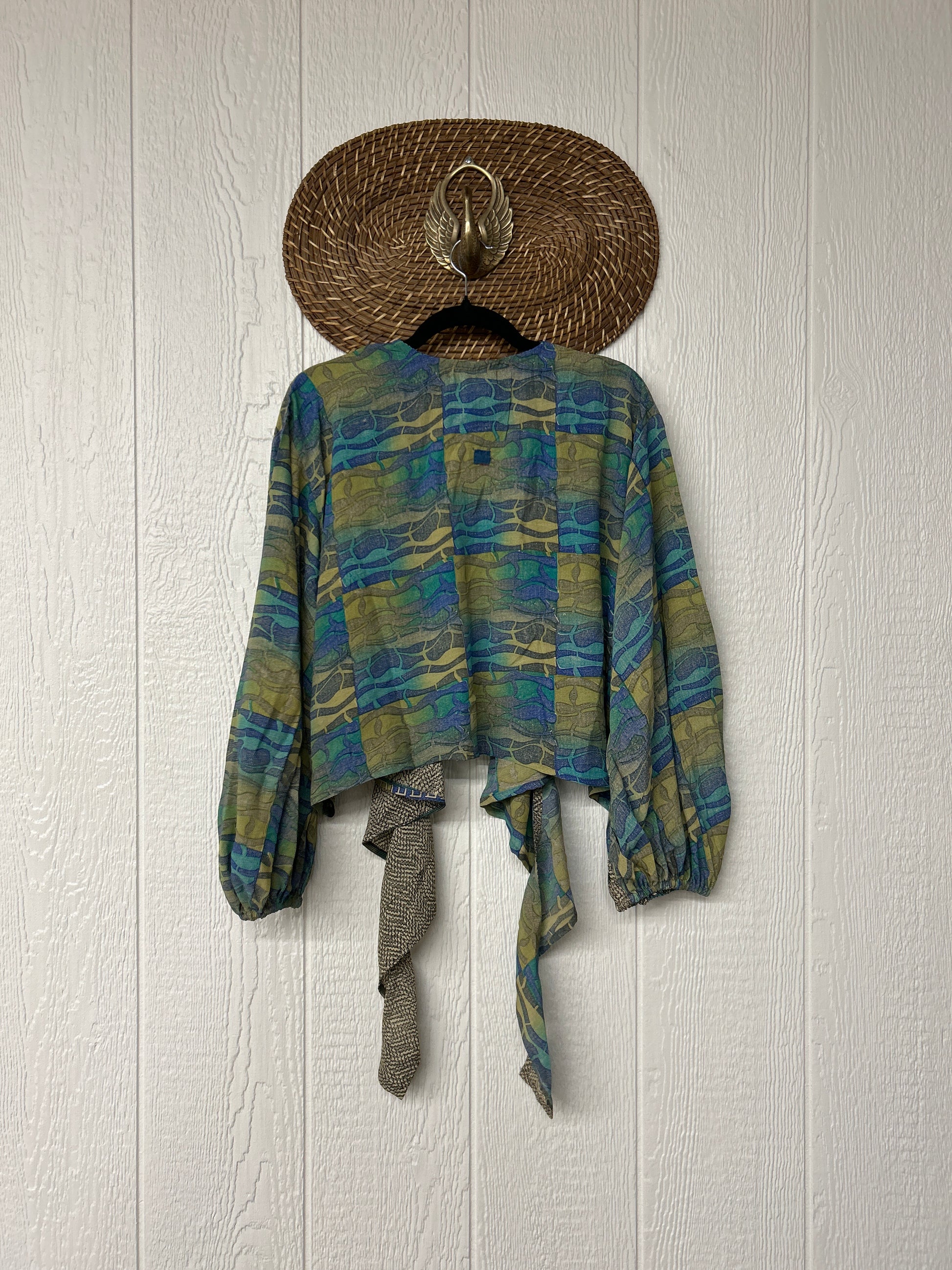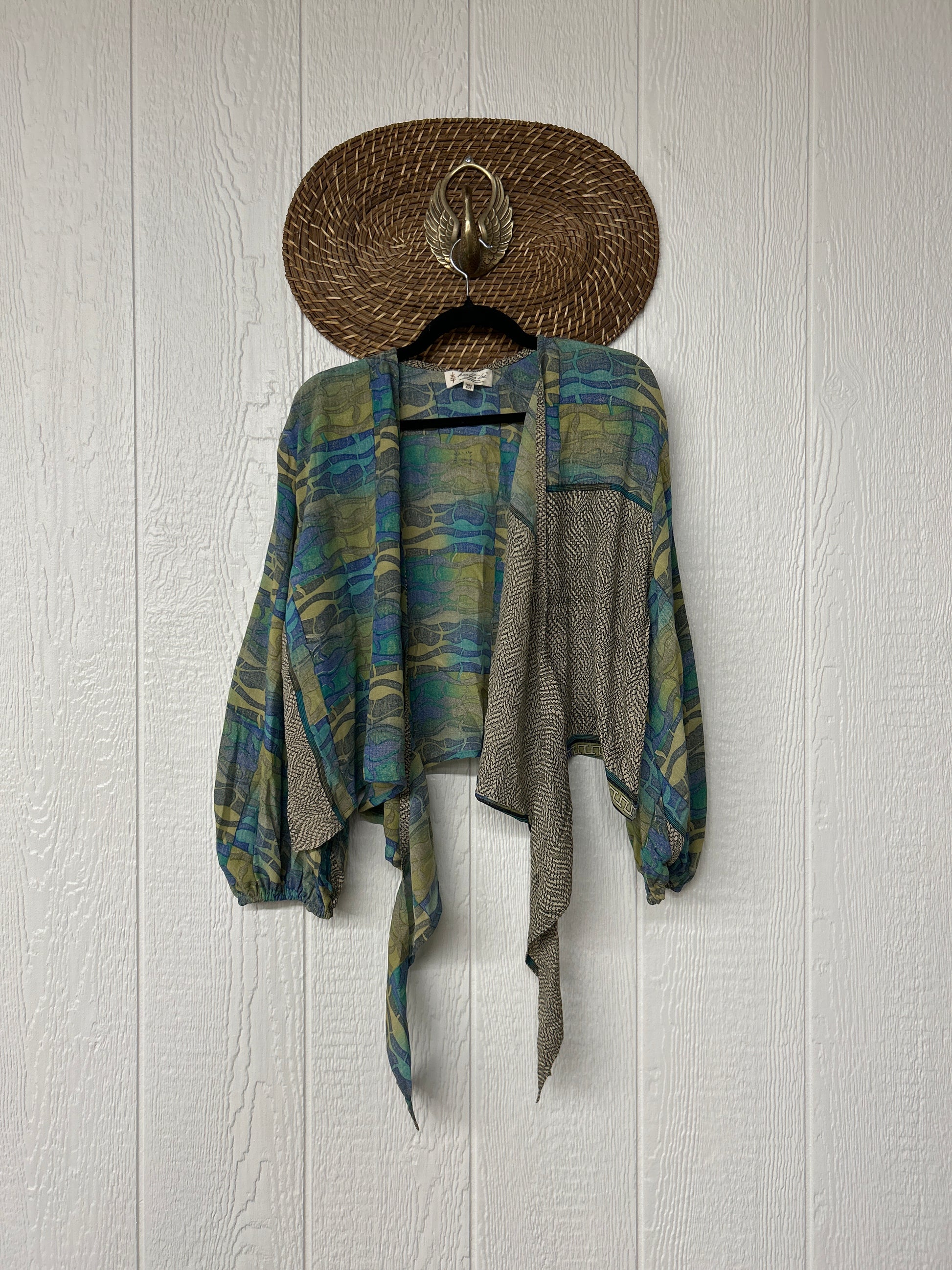 Crafted from vintage crepe silk sari this floaty layer features bounce bell sleeves and a tie closure long enough to wrap around your body. We know this will be one of your new favorites.