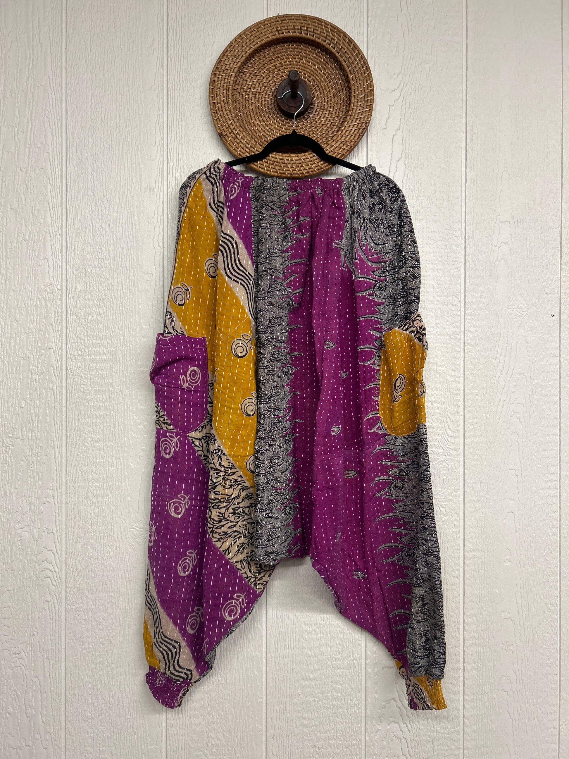 Made from our vintage kantha cotton sari with a super slouchy low harem crotch drop, slouchy exterior pockets, elastic waist with drawstring snd soft smocked elastic on the ankles.