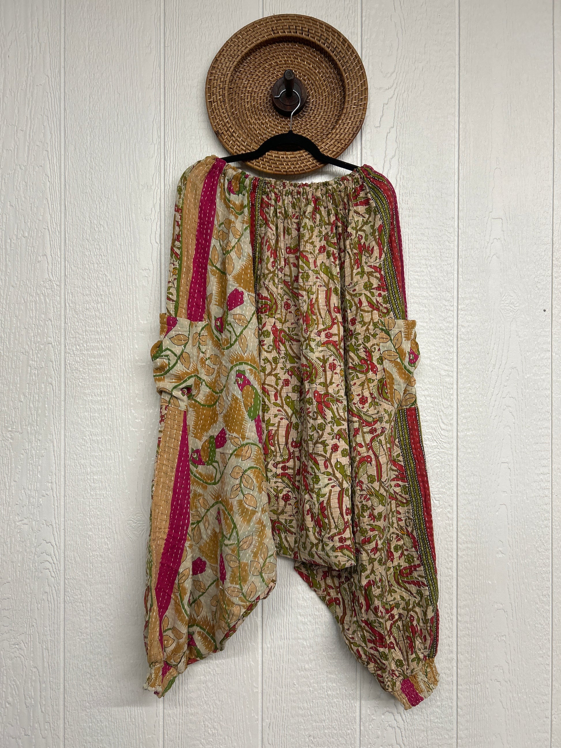 Made from our vintage kantha cotton sari with a super slouchy low harem crotch drop, slouchy exterior pockets, elastic waist with drawstring snd soft smocked elastic on the ankles.
