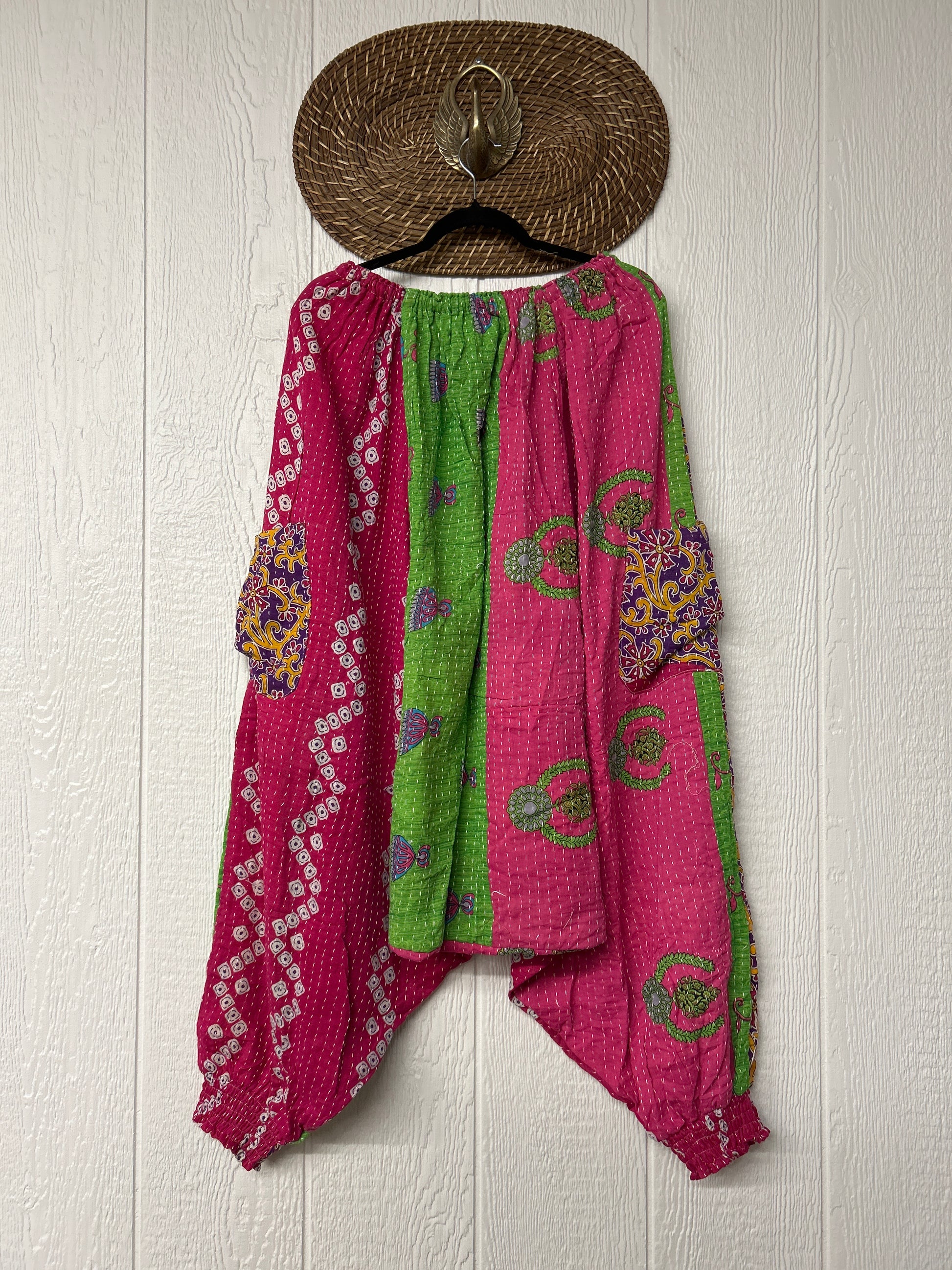 Made from our vintage kantha cotton sari with a super slouchy low harem crotch drop, slouchy exterior pockets, elastic waist with drawstring snd soft smocked elastic on the ankles.