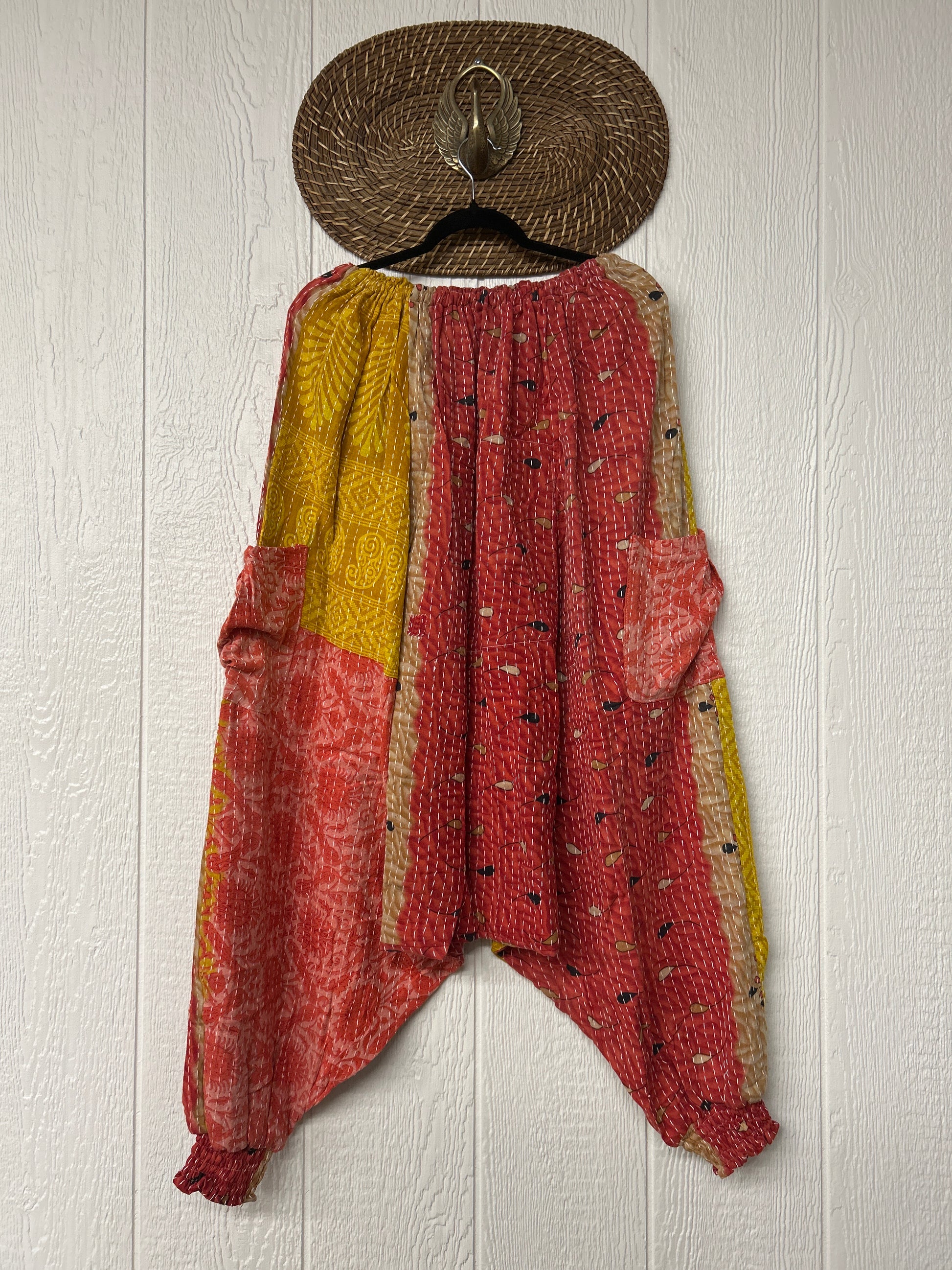 Made from our vintage kantha cotton sari with a super slouchy low harem crotch drop, slouchy exterior pockets, elastic waist with drawstring snd soft smocked elastic on the ankles.