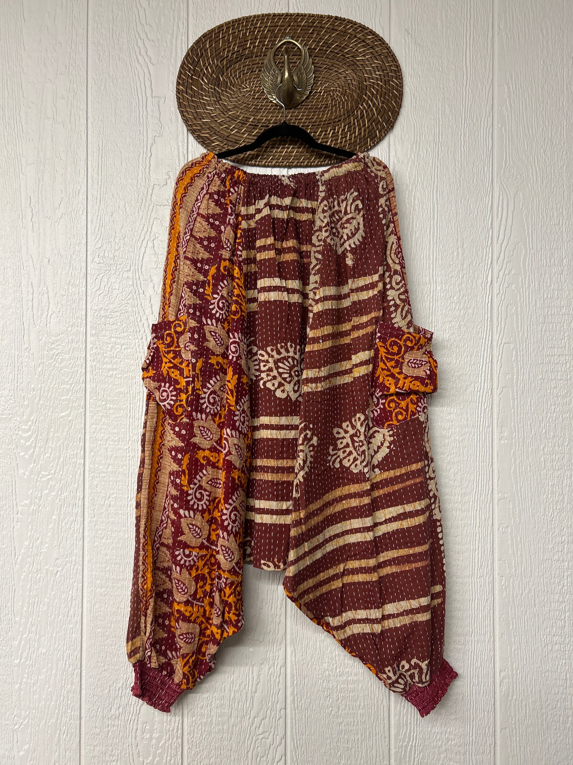 Made from our vintage kantha cotton sari with a super slouchy low harem crotch drop, slouchy exterior pockets, elastic waist with drawstring snd soft smocked elastic on the ankles.