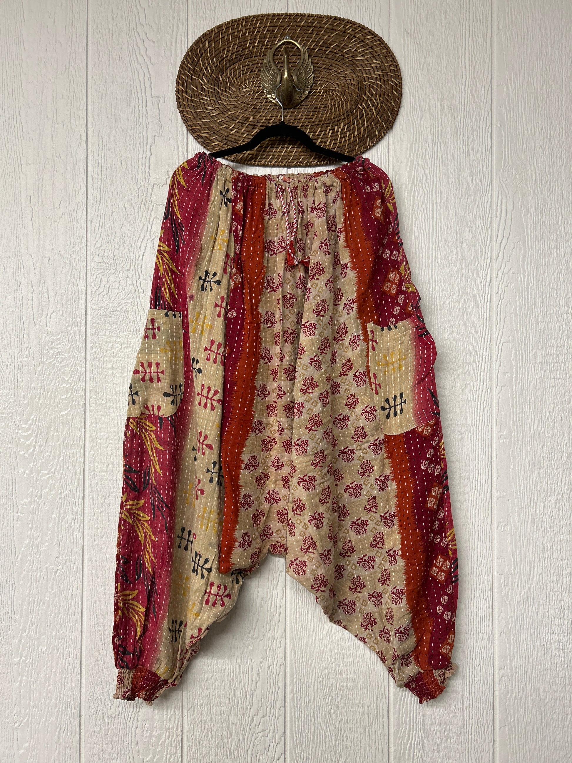 Made from our vintage kantha cotton sari with a super slouchy low harem crotch drop, slouchy exterior pockets, elastic waist with drawstring snd soft smocked elastic on the ankles.