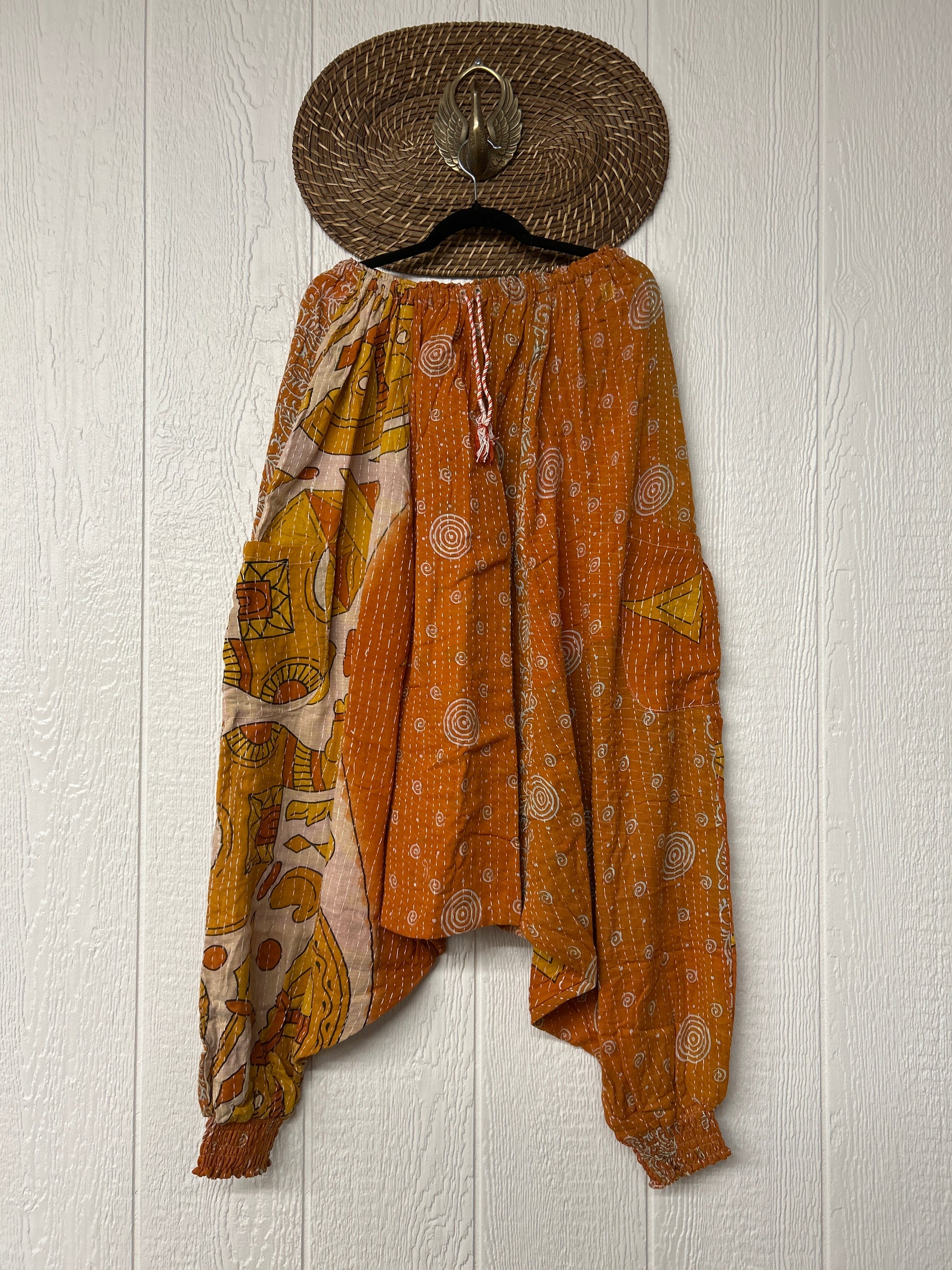 Made from our vintage kantha cotton sari with a super slouchy low harem crotch drop, slouchy exterior pockets, elastic waist with drawstring snd soft smocked elastic on the ankles.