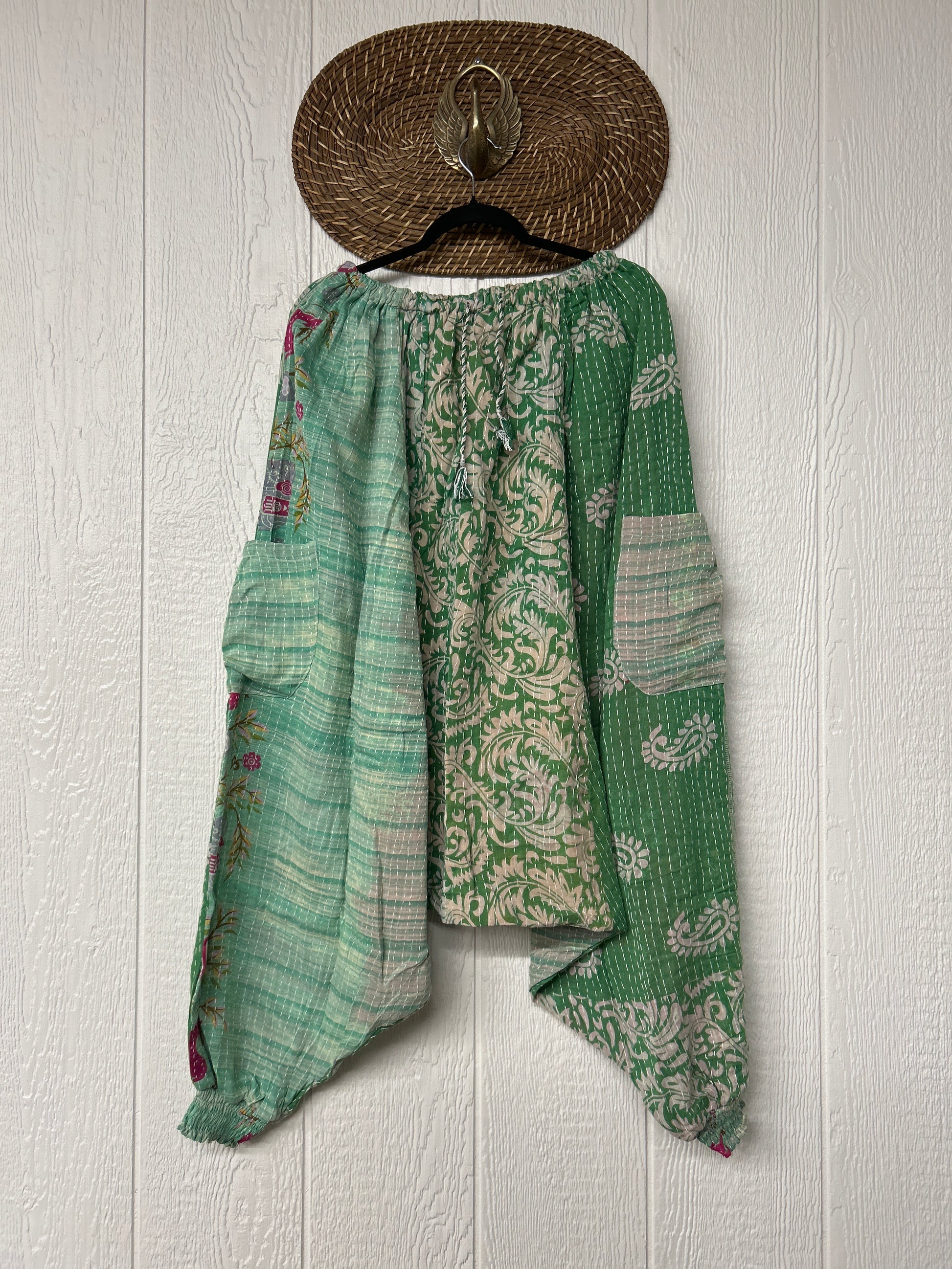 Made from our vintage kantha cotton sari with a super slouchy low harem crotch drop, slouchy exterior pockets, elastic waist with drawstring snd soft smocked elastic on the ankles.