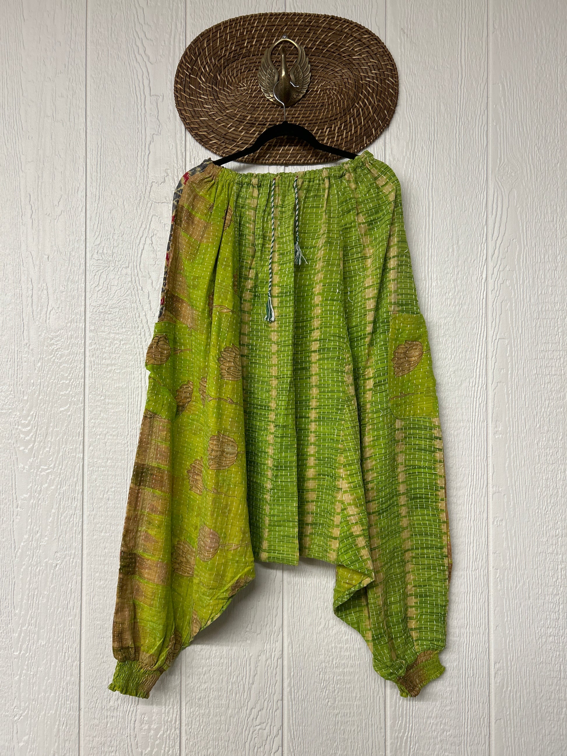 Made from our vintage kantha cotton sari with a super slouchy low harem crotch drop, slouchy exterior pockets, elastic waist with drawstring snd soft smocked elastic on the ankles.