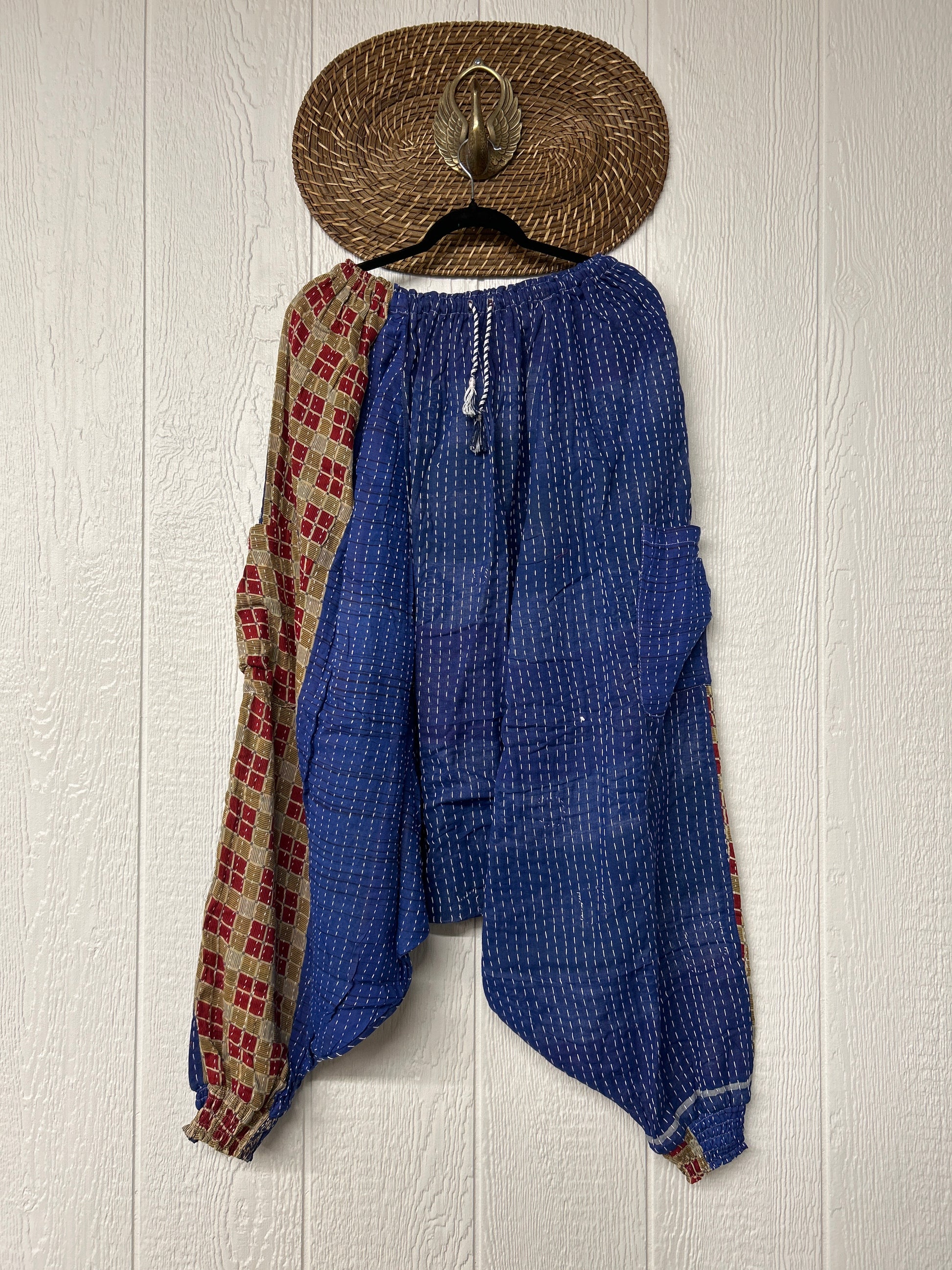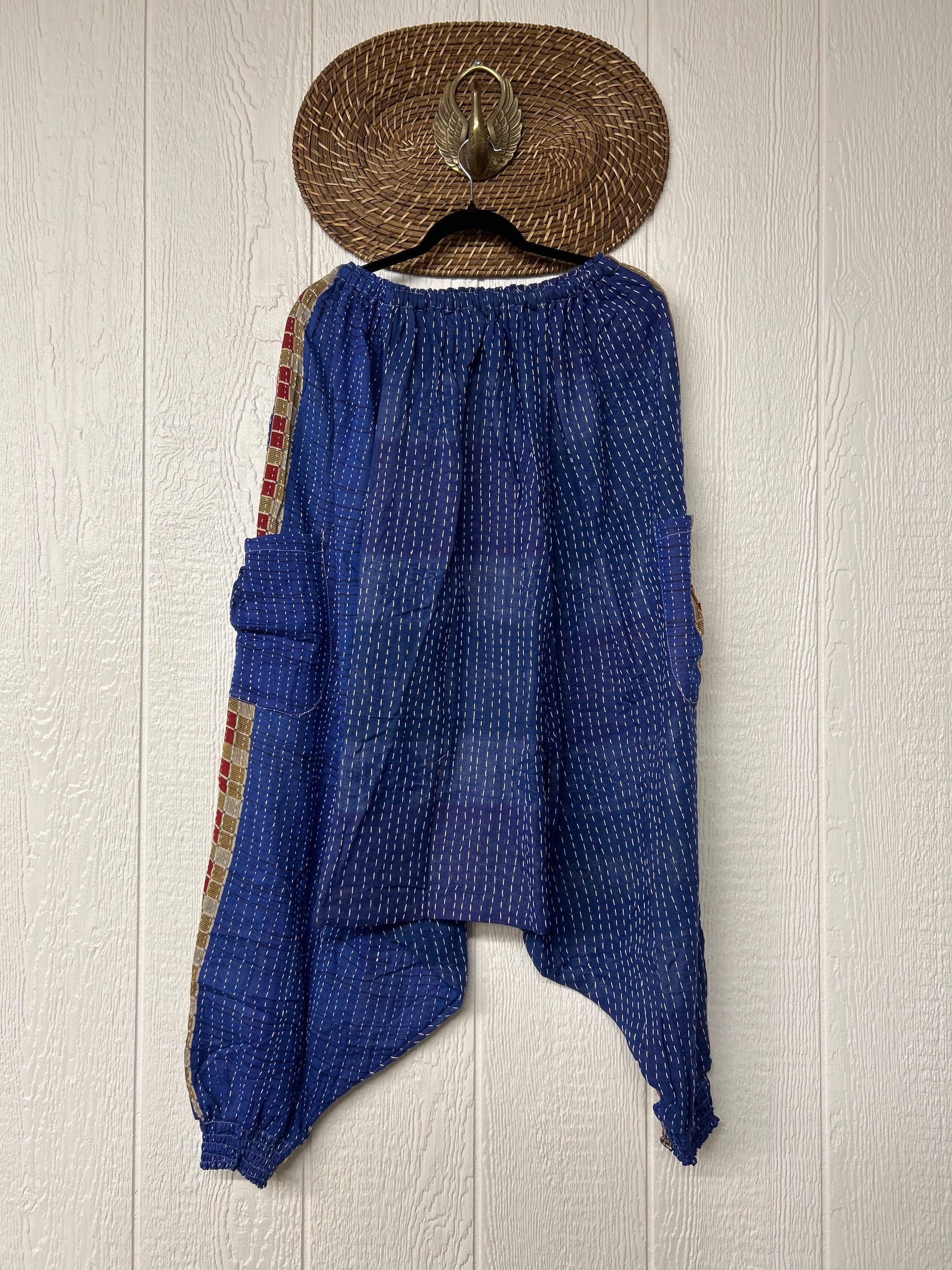 Made from our vintage kantha cotton sari with a super slouchy low harem crotch drop, slouchy exterior pockets, elastic waist with drawstring snd soft smocked elastic on the ankles.