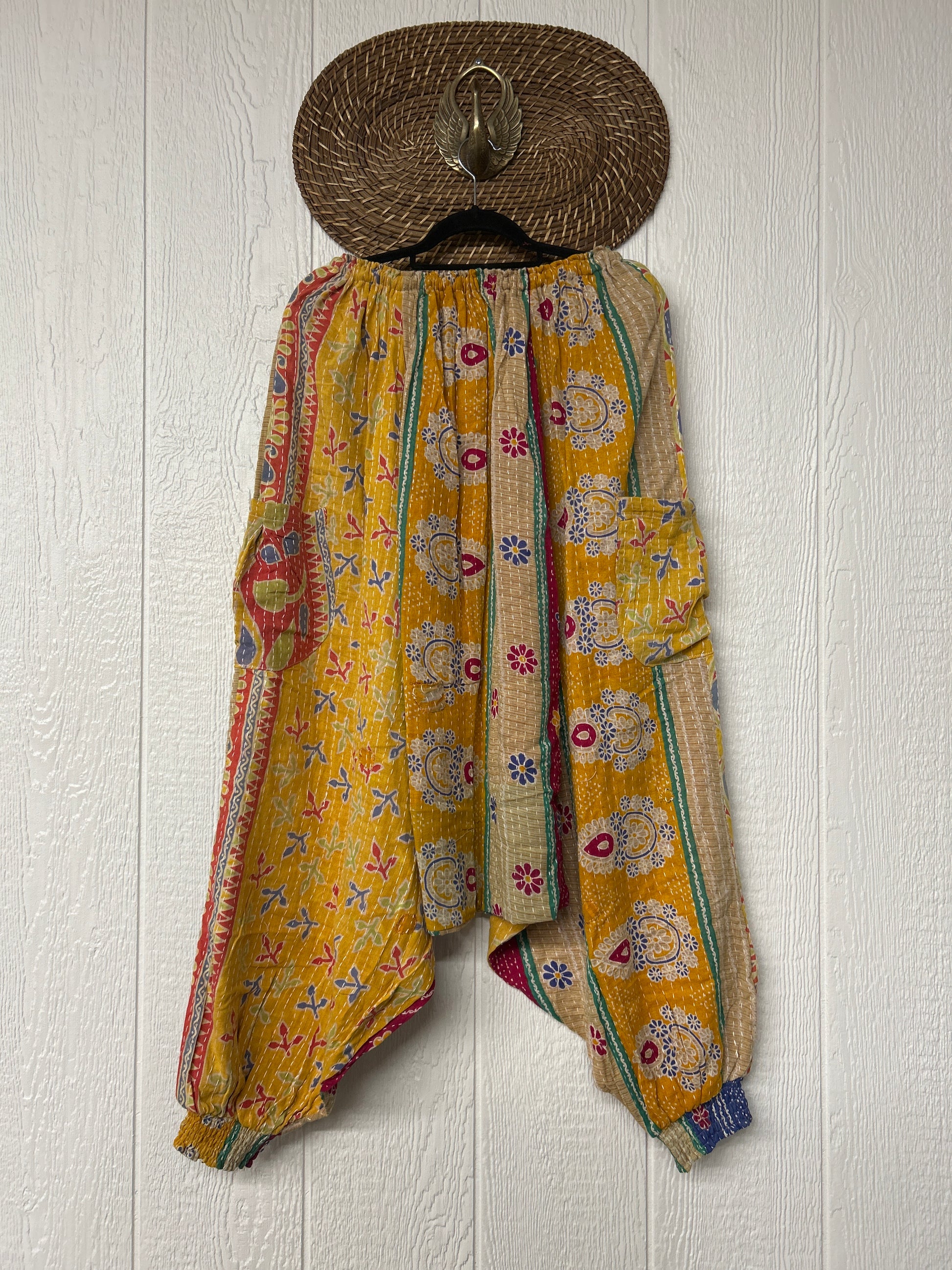 Made from our vintage kantha cotton sari with a super slouchy low harem crotch drop, slouchy exterior pockets, elastic waist with drawstring snd soft smocked elastic on the ankles.