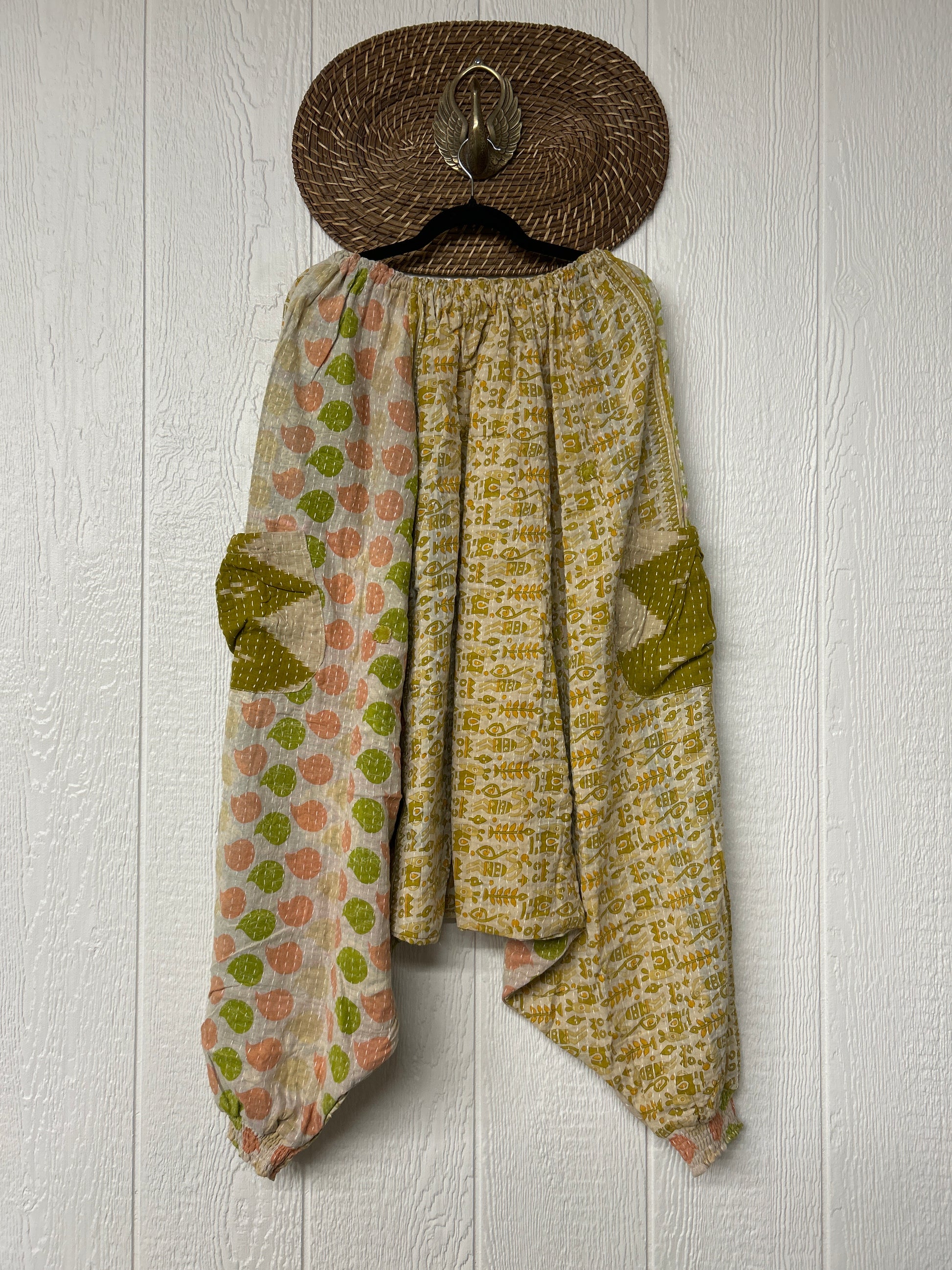 Made from our vintage kantha cotton sari with a super slouchy low harem crotch drop, slouchy exterior pockets, elastic waist with drawstring snd soft smocked elastic on the ankles.