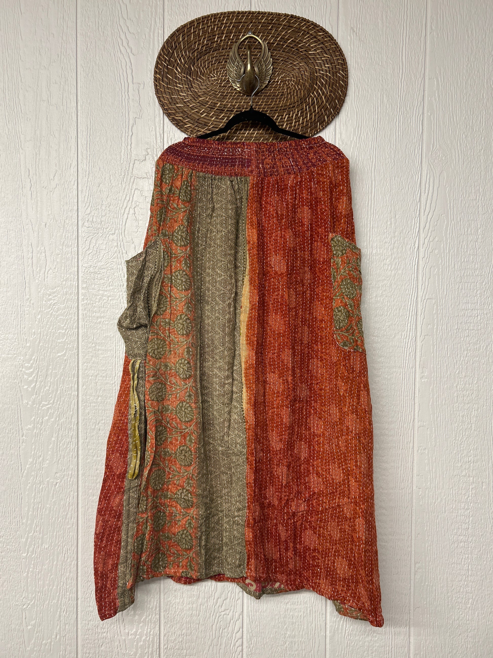 Crafted from kantha stitched vintage cotton sari this absolute dream features slouchy side pockets with a butterfly drawstring to cinch the sides, a button front skirt and a stretchy free size waist.