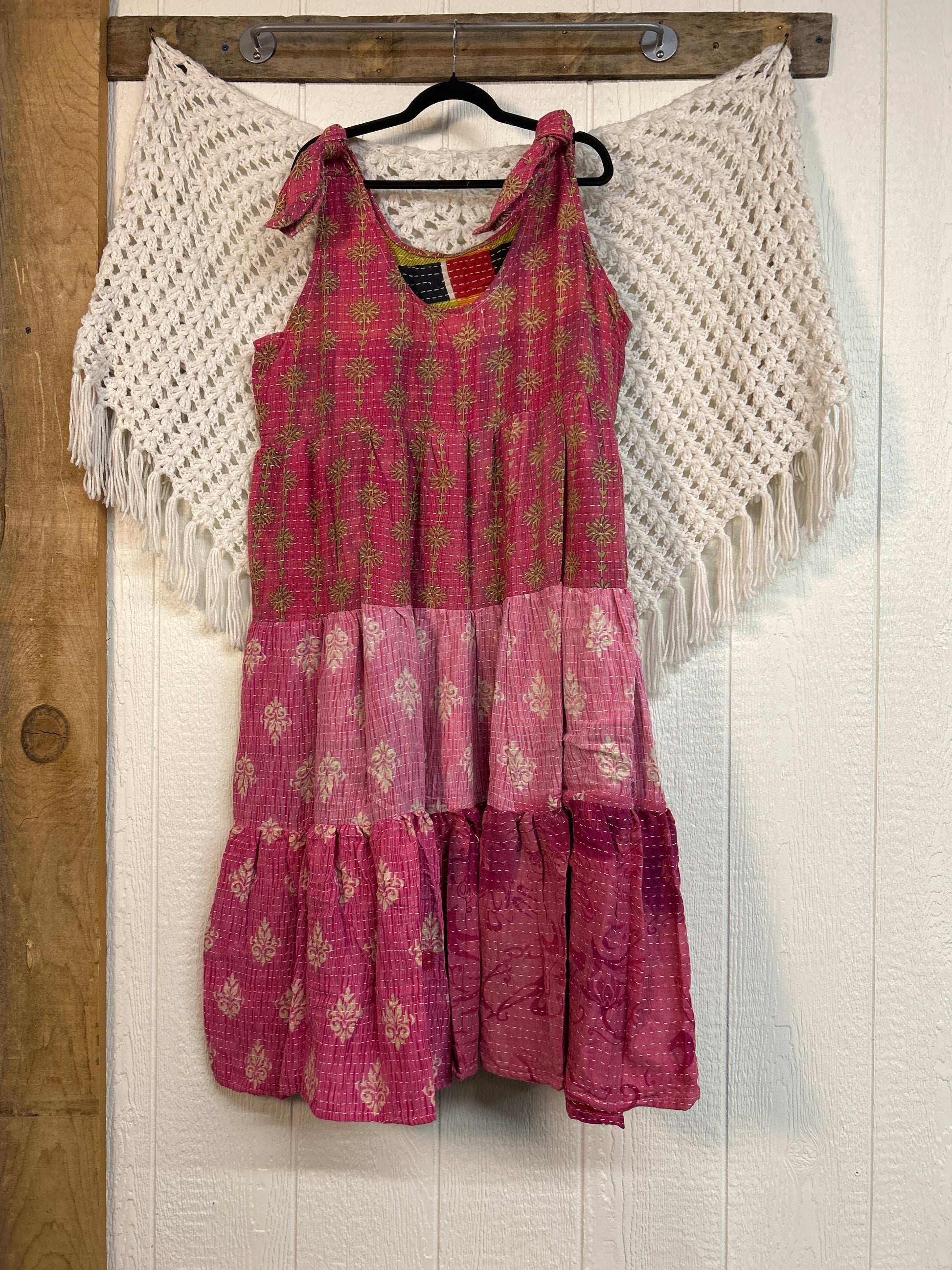 Fabrics may have small threads or holes in the layers. Color inconsistency or small stains may be present. The saris are sewn together and extend the life of each design. Imperfections should be celebrated.