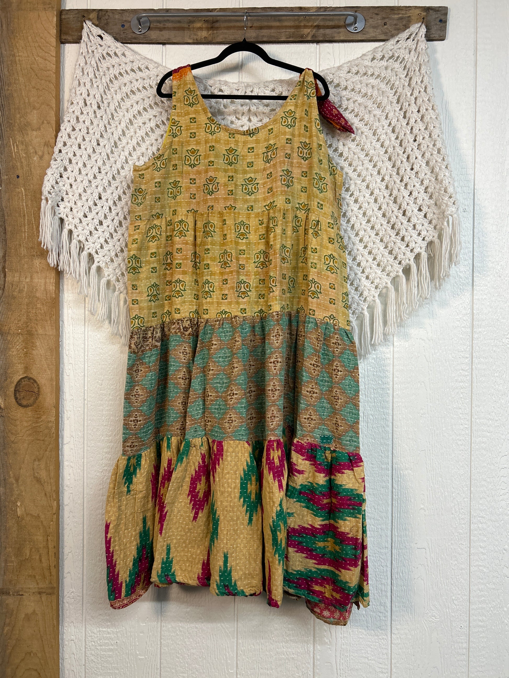 Fabrics may have small threads or holes in the layers. Color inconsistency or small stains may be present. The saris are sewn together and extend the life of each design. Imperfections should be celebrated.