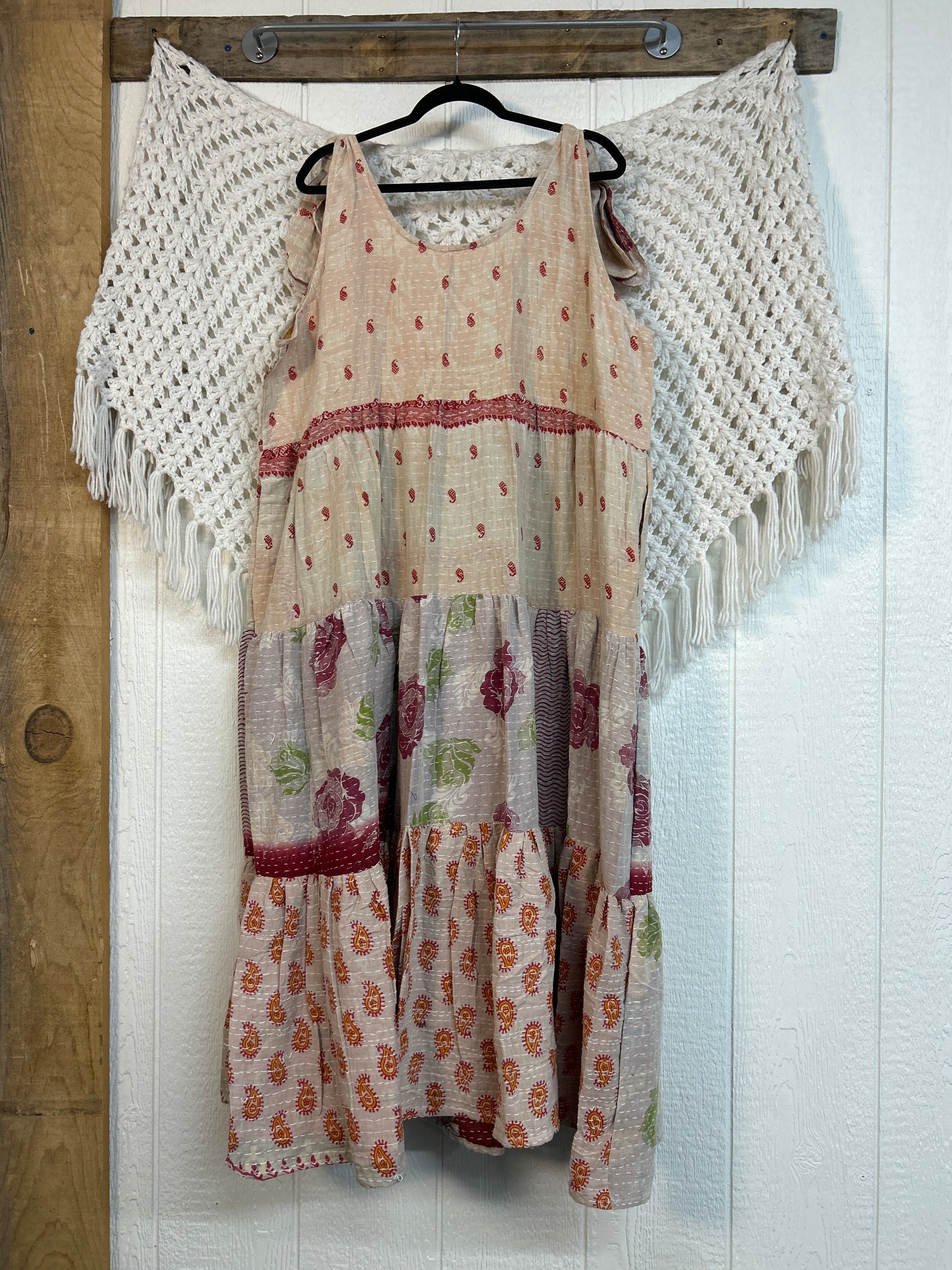 Fabrics may have small threads or holes in the layers. Color inconsistency or small stains may be present. The saris are sewn together and extend the life of each design. Imperfections should be celebrated.