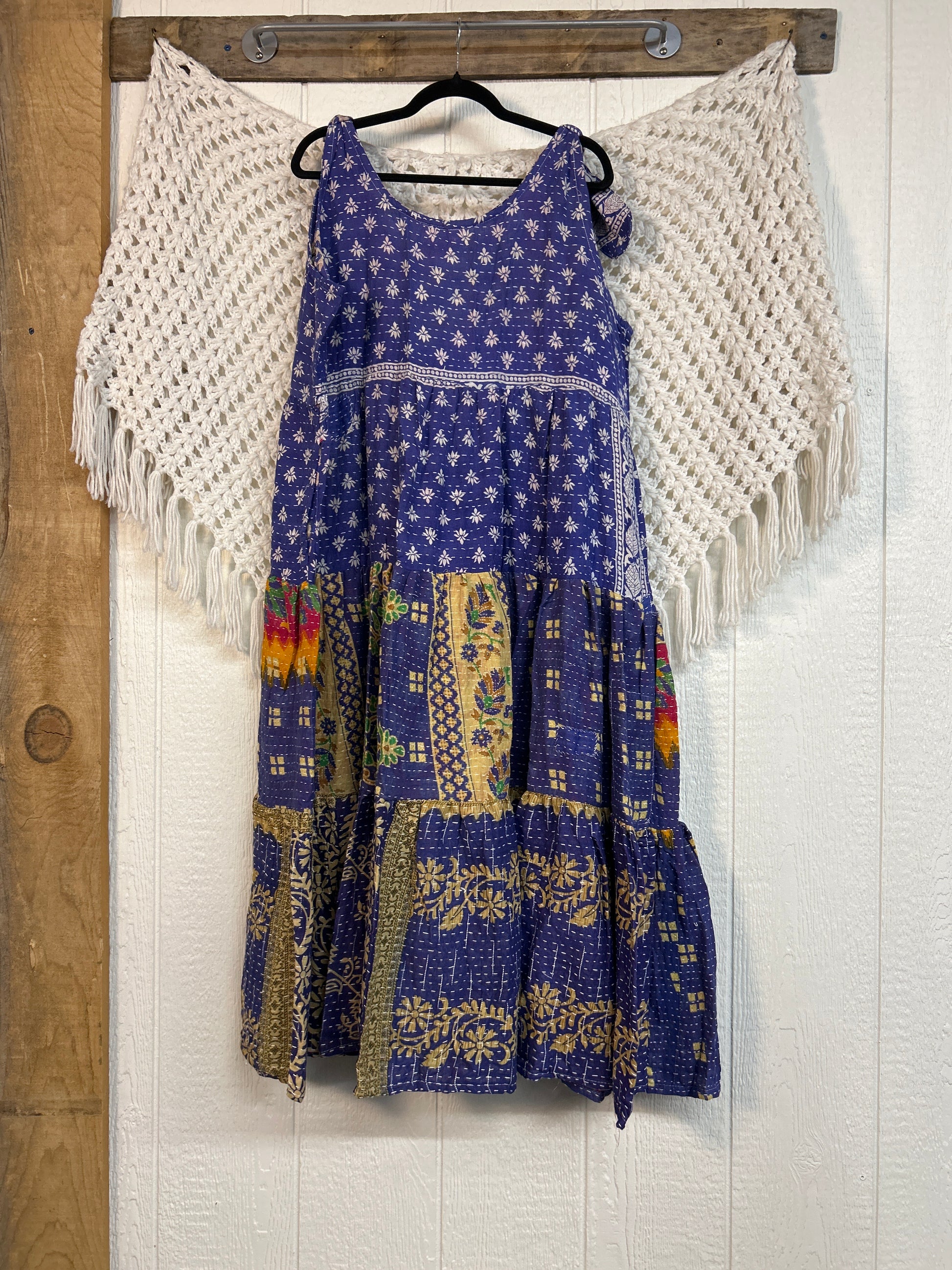 Fabrics may have small threads or holes in the layers. Color inconsistency or small stains may be present. The saris are sewn together and extend the life of each design. Imperfections should be celebrated.