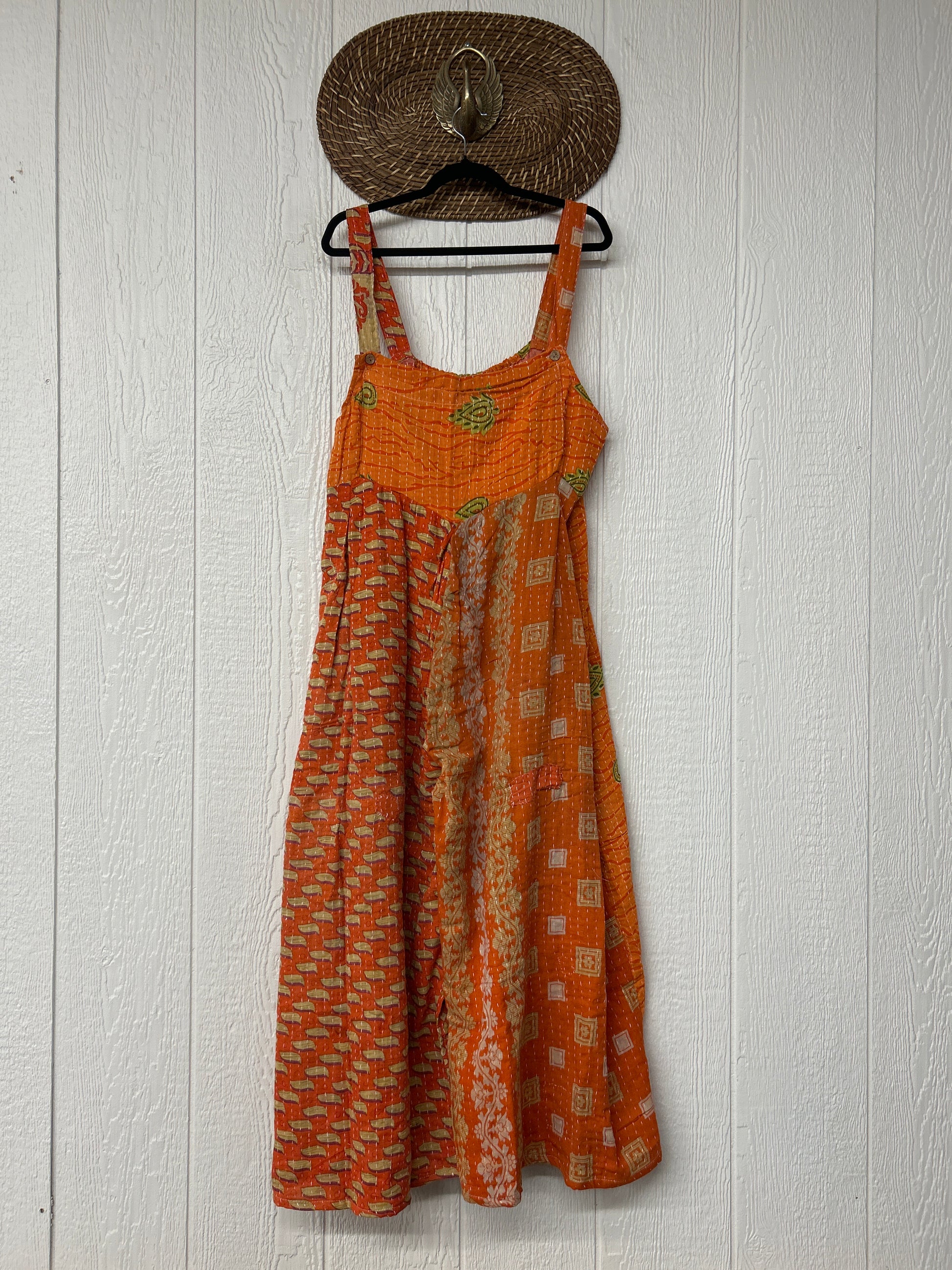 Features adjustable button straps, deep interior pockets, front bib pocket and wide flowy legs