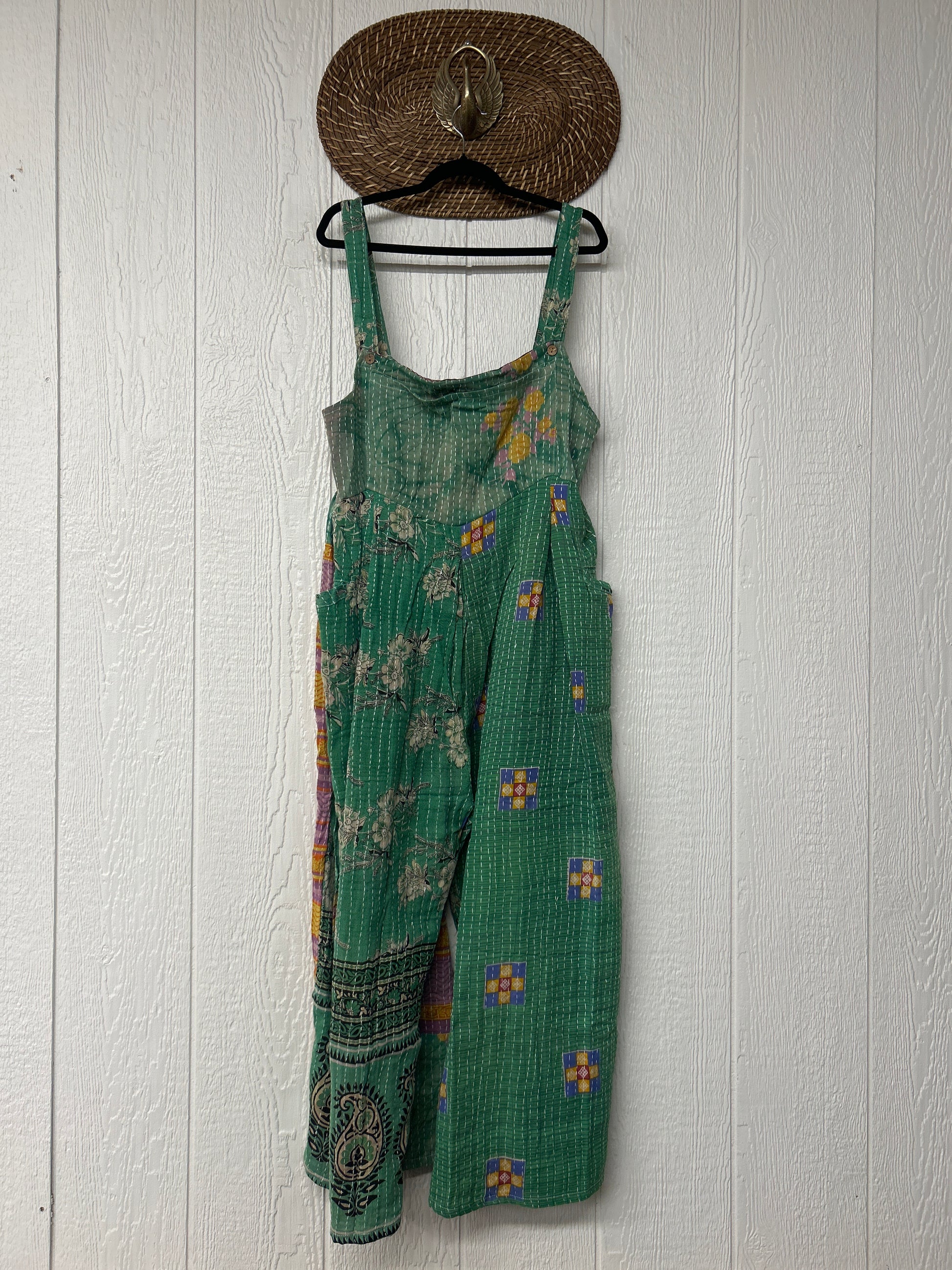 Features adjustable button straps, deep interior pockets, front bib pocket and wide flowy legs